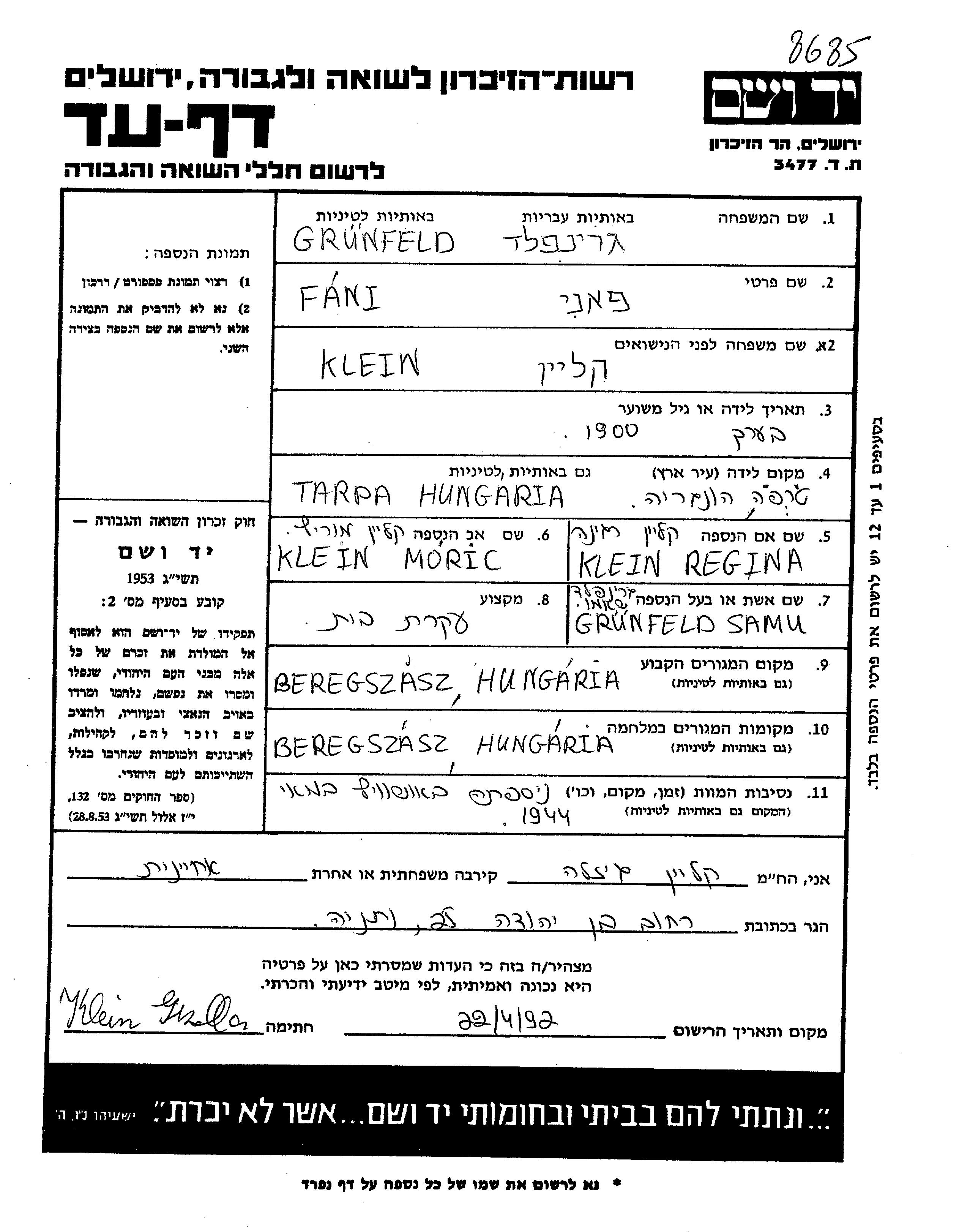 Фани Грюнфельд, девичья фамилия Клейн, место рождения: Тарпа, Венгрия. Отец: Мориц, mать:Регина. Домохозяйка. Женат / замужем. Место жительства до войны: Берегсас, Чехословакия. Место во время войны: Берегсас, Чехословакия.
