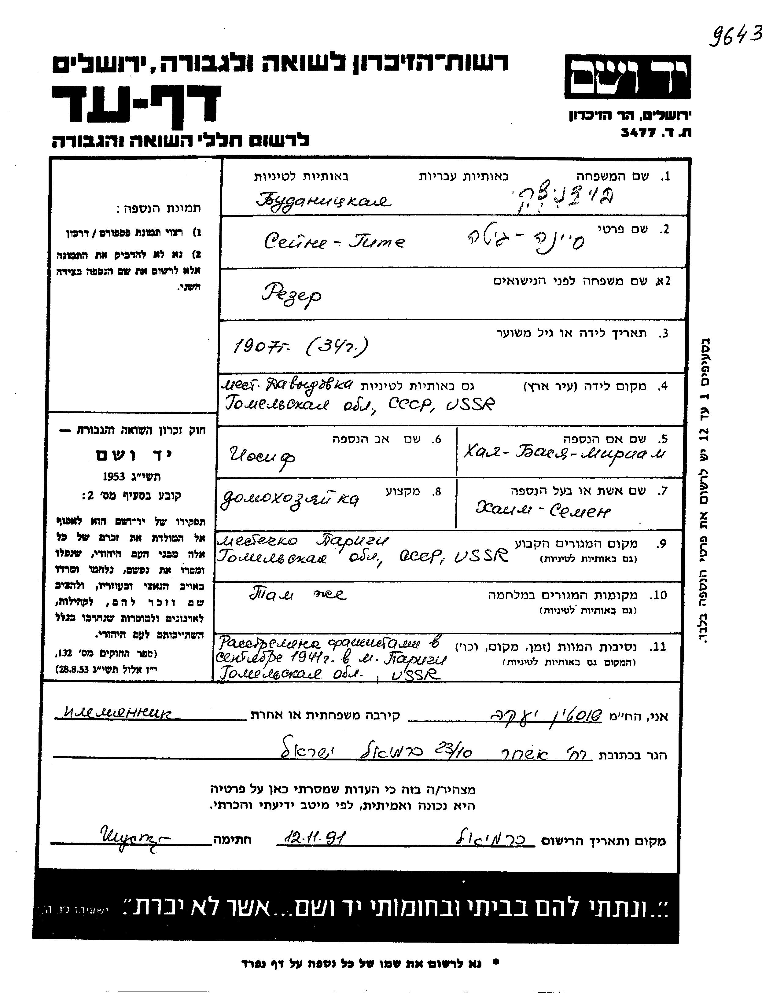 Яд Вашем - Листы свидетельских показаний Мемориального фонда