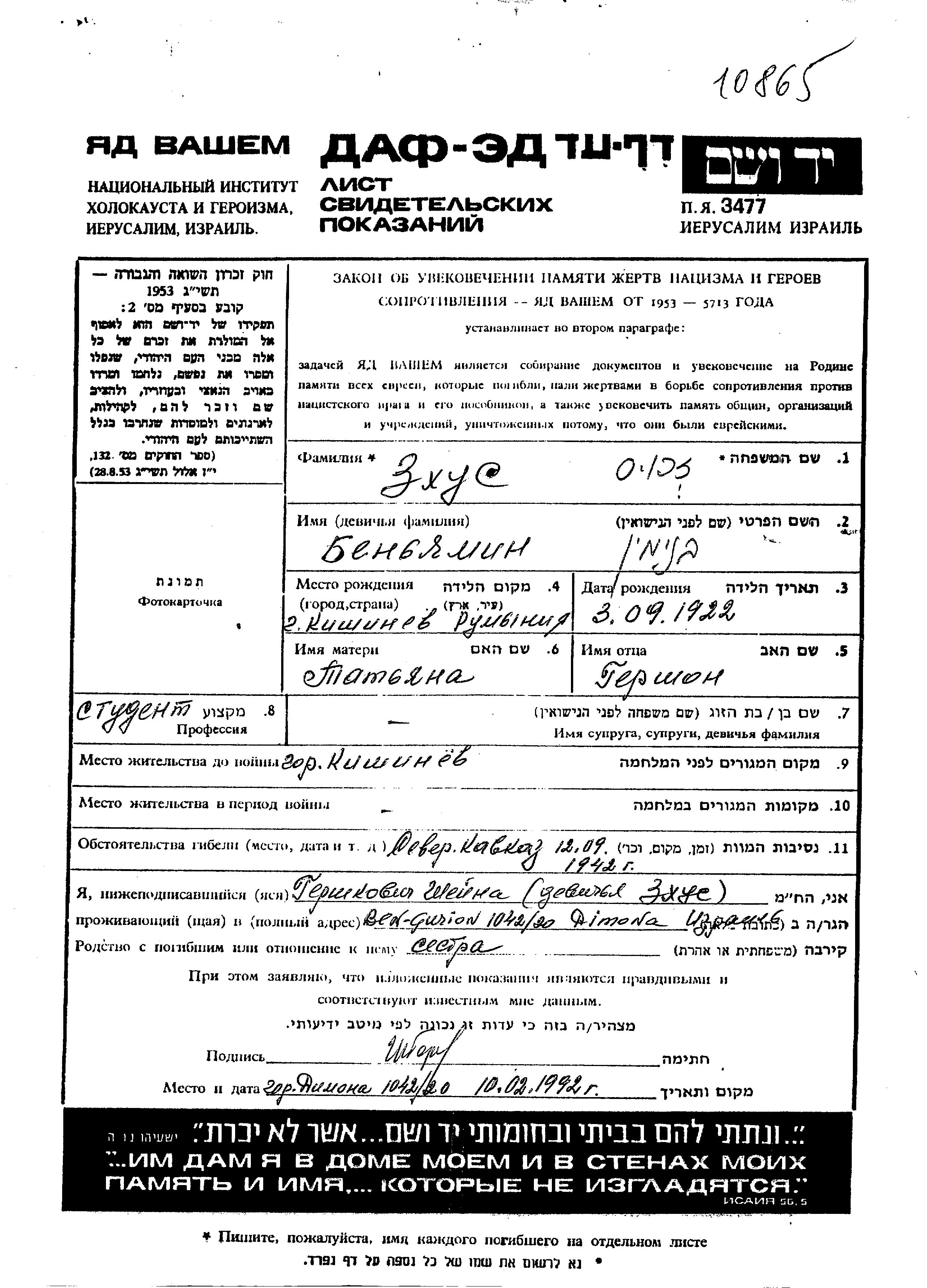 Зхус Беньямин 1922 Кишинёв, Румыния Лист свидетельских показаний