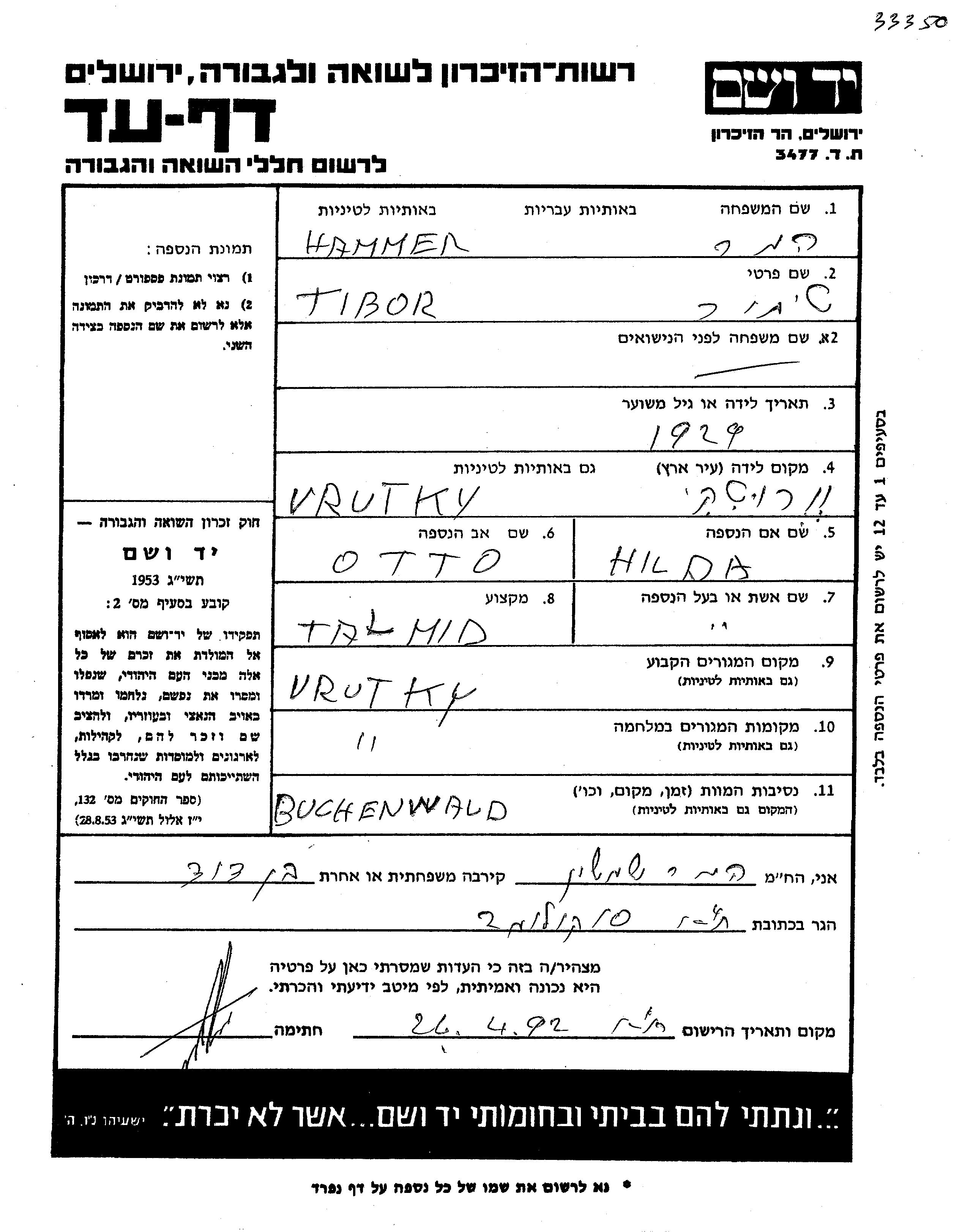 Хаммер Тибор 1929 Врутки, Чехословакия Лист свидетельских показаний
