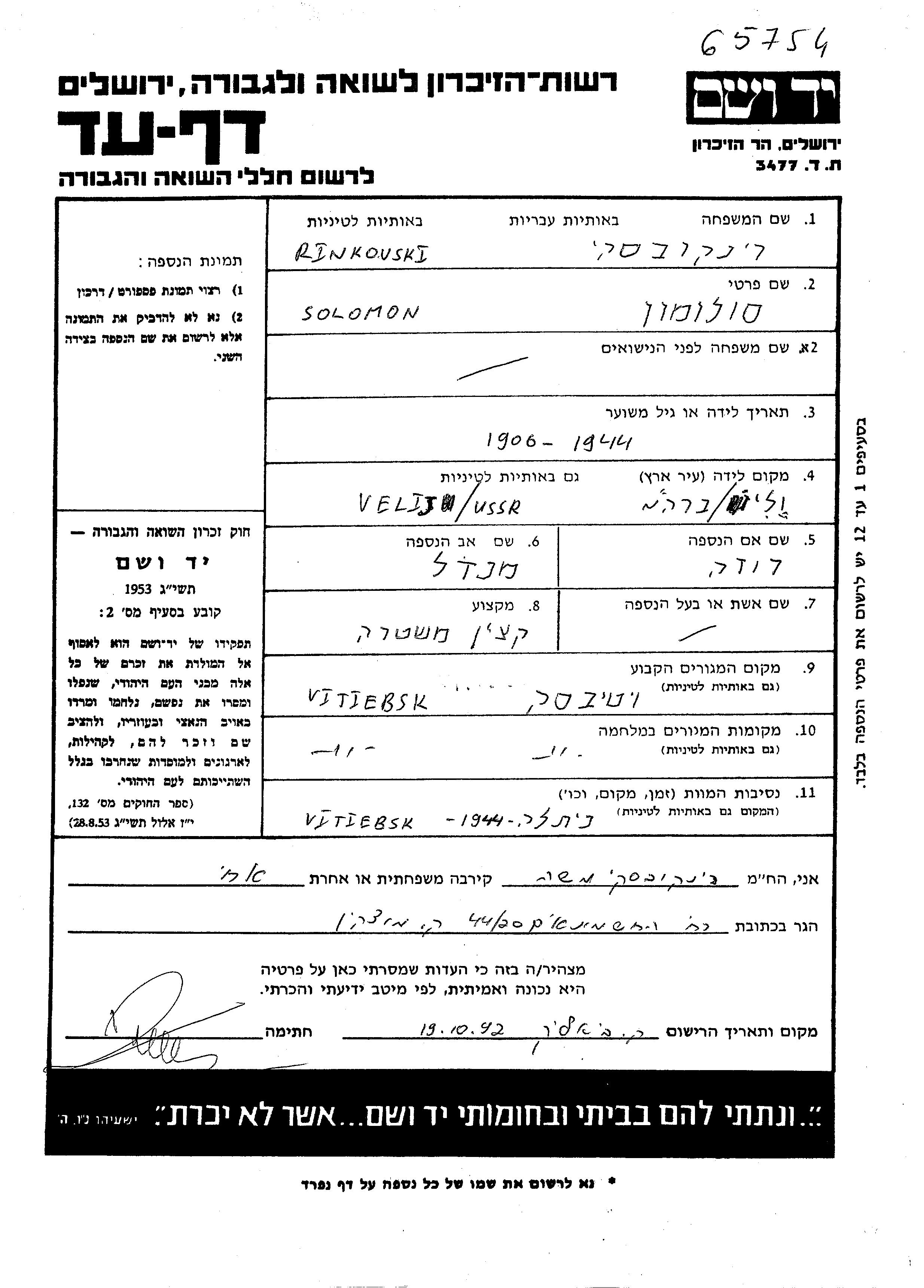 Ринковски Соломон 1906 Витебск, Белоруссия (СССР) Лист свидетельских показаний