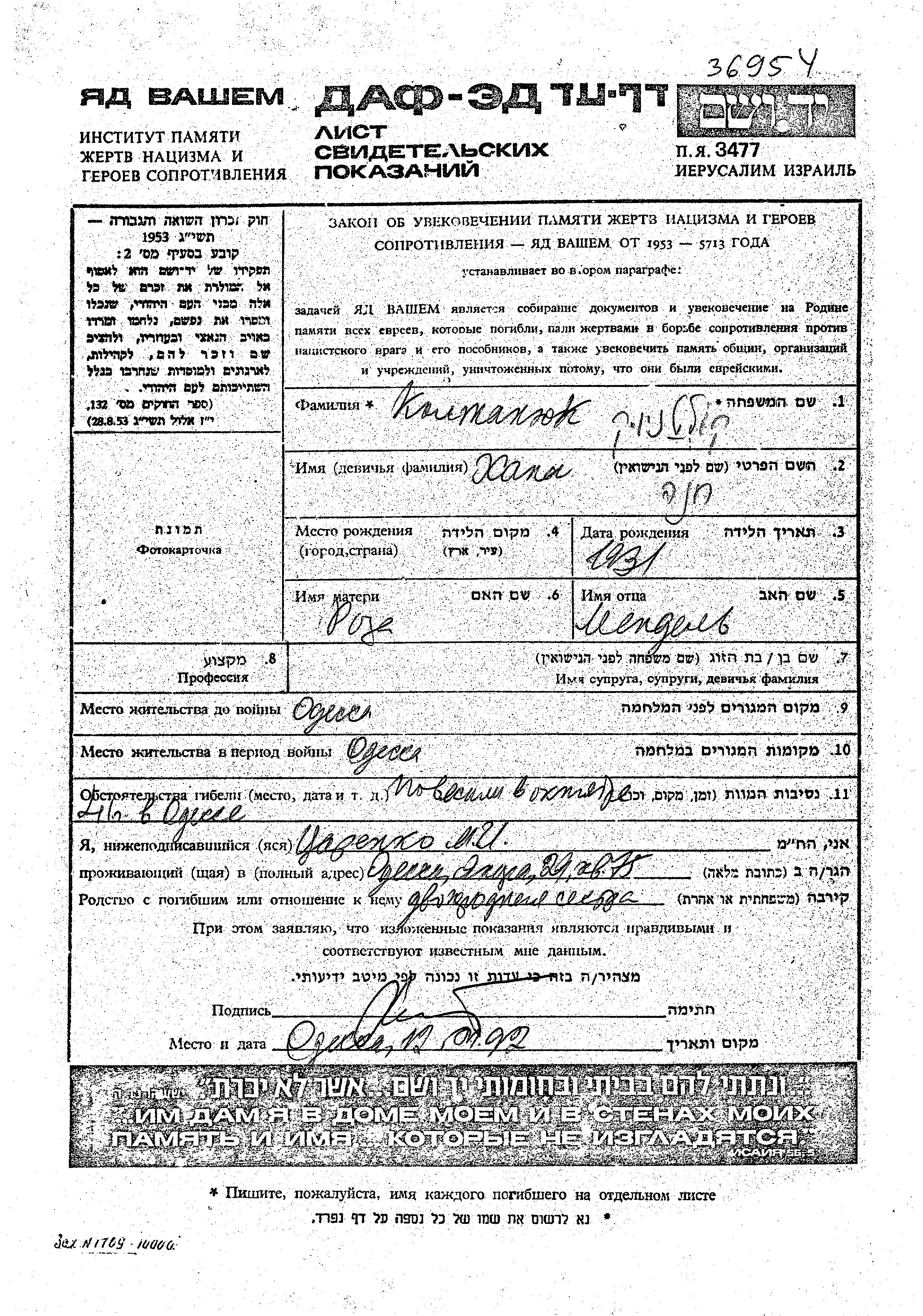 Колтанюк Хана 1931 Одесса, Украина (СССР) Лист свидетельских показаний