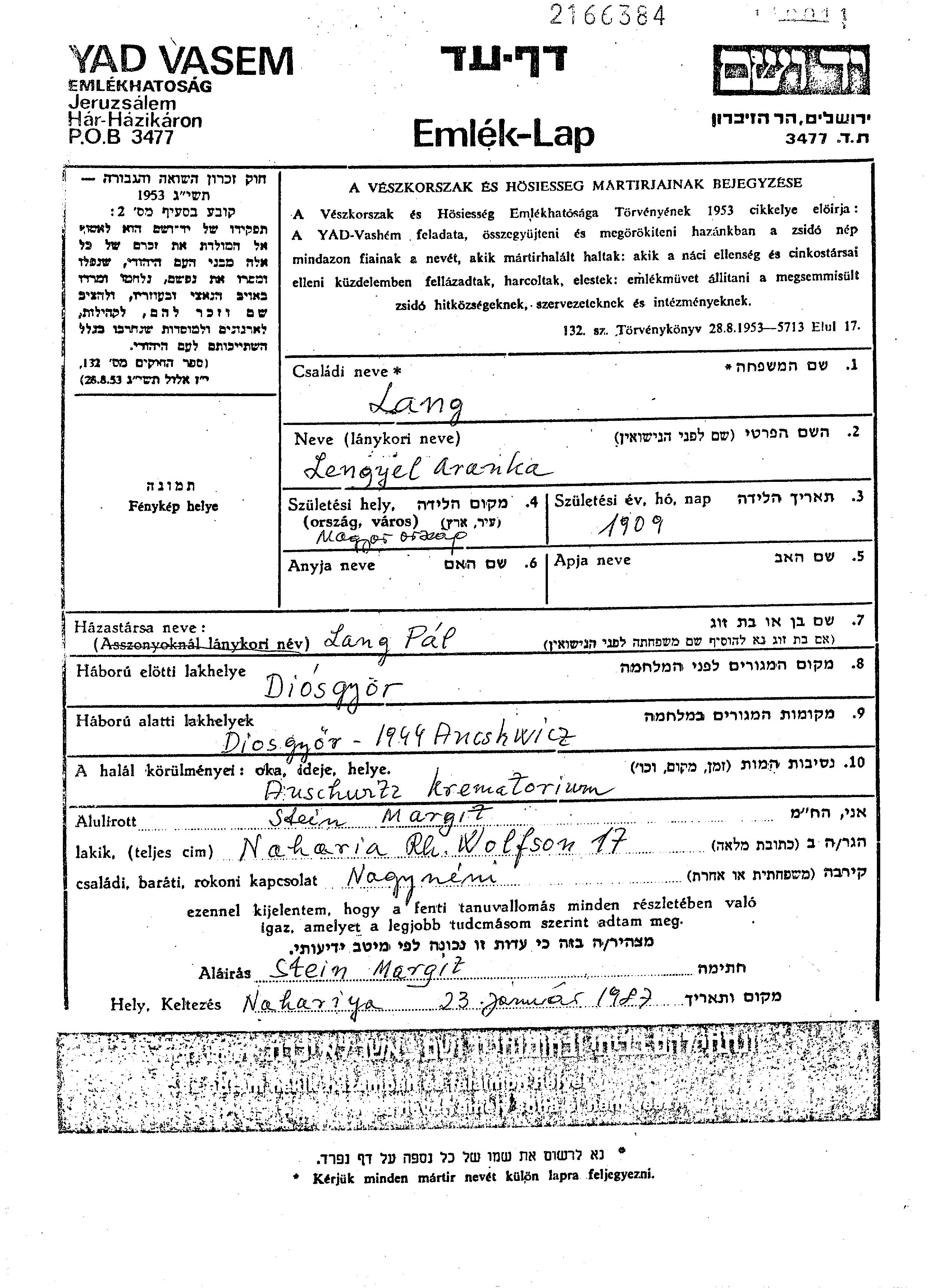 Аранка Ланг, девичья фамилия Лендьель, место рождения: Венгрия. Женат / замужем. Место жительства до войны: Диошдьёр, Венгрия. Место во время войны: Диошдьёр, Венгрия.