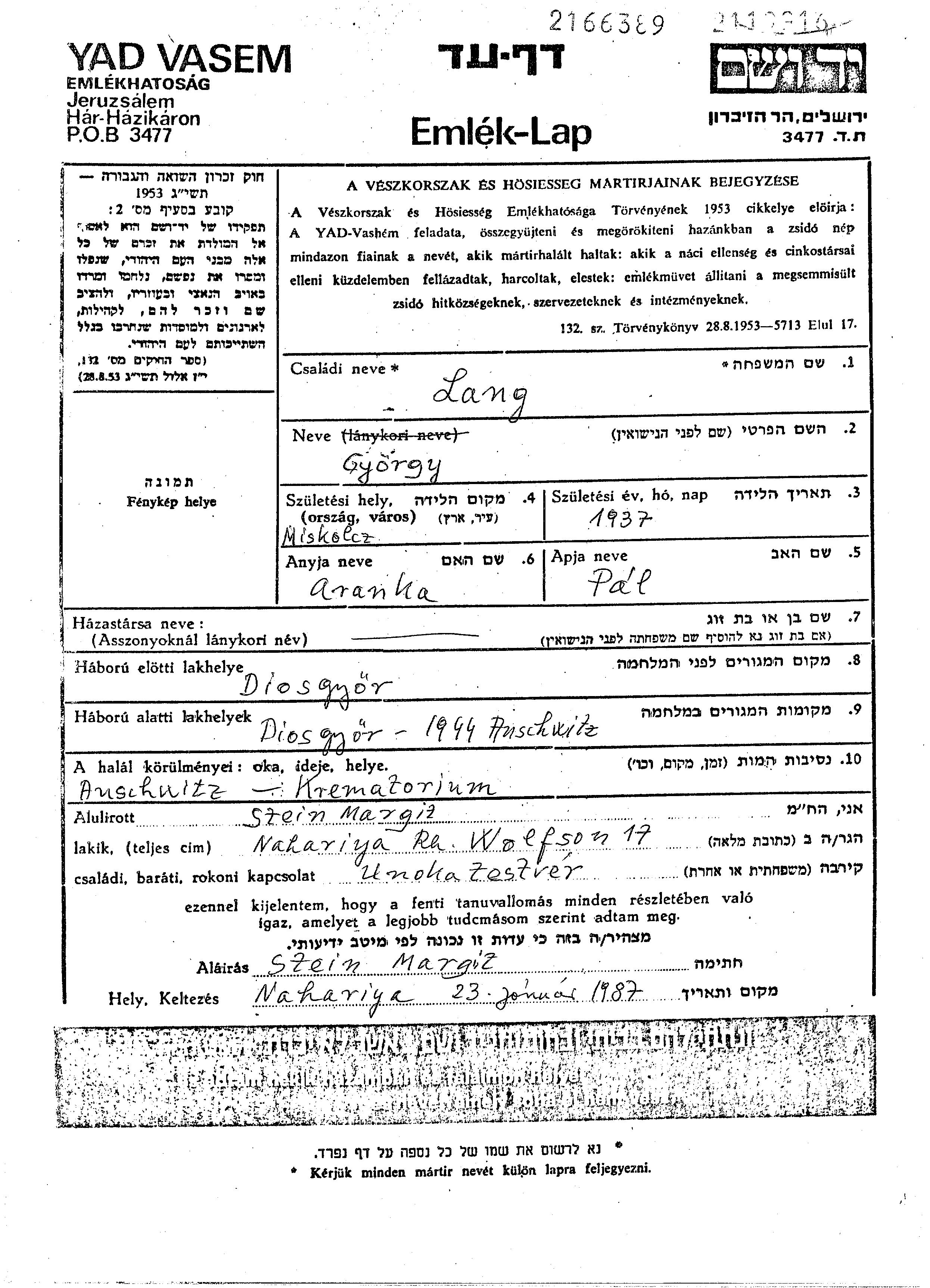 Дьёрдь Ланг, место рождения: Мишкольц, Венгрия. Отец: Паль, mать:Аранка, девичья фамилия Лендьель. Ребенок. Место жительства до войны: Диошдьёр, Венгрия. Место во время войны: Диошдьёр, Венгрия.