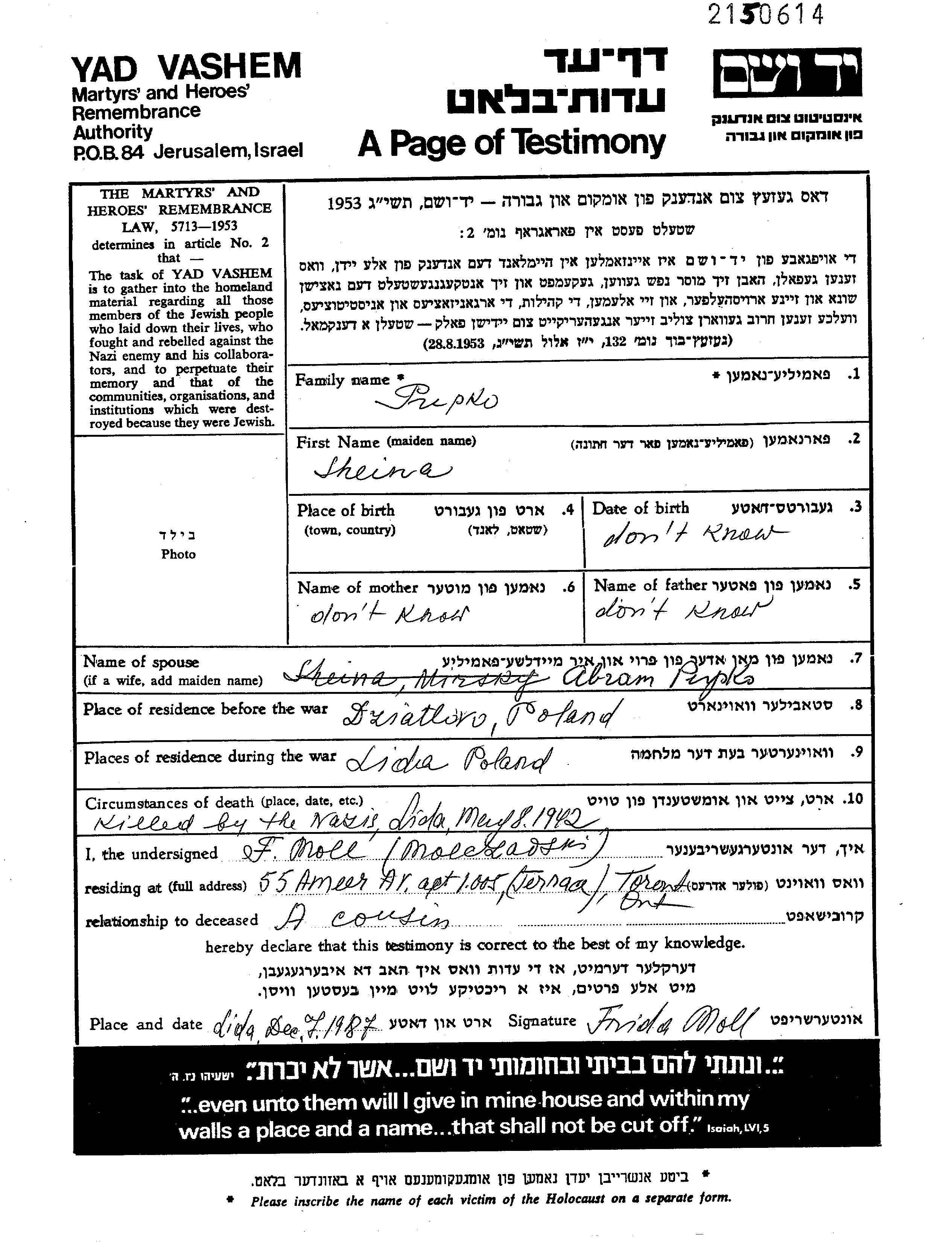 Шейна Пупко Попко, девичья фамилия Мирски. Женат / замужем. Место жительства до войны: Здзенцёл, Польша. Место во время войны: Лида, Польша.