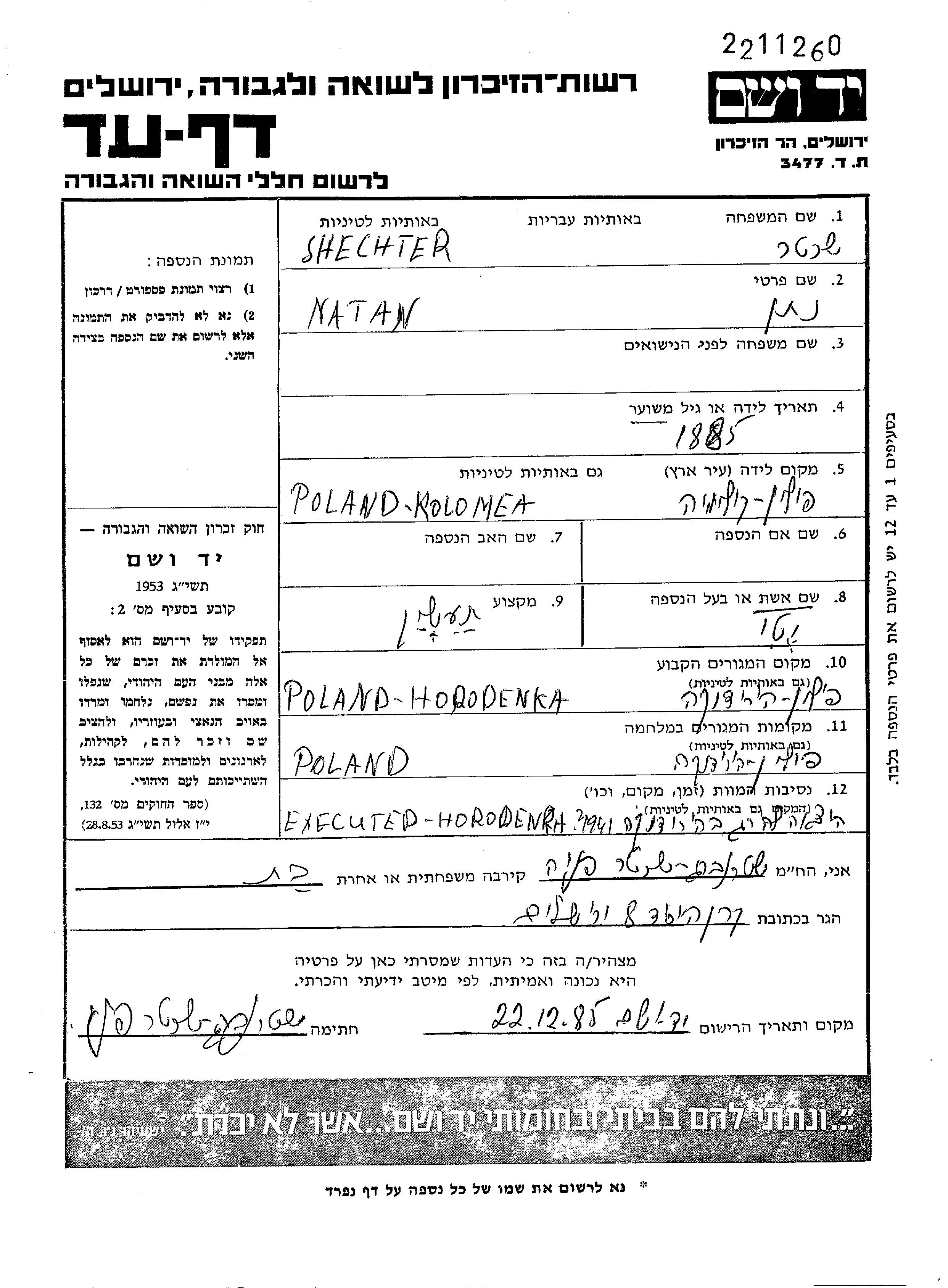 Шехтер Натан Городенка, Польша Лист свидетельских показаний