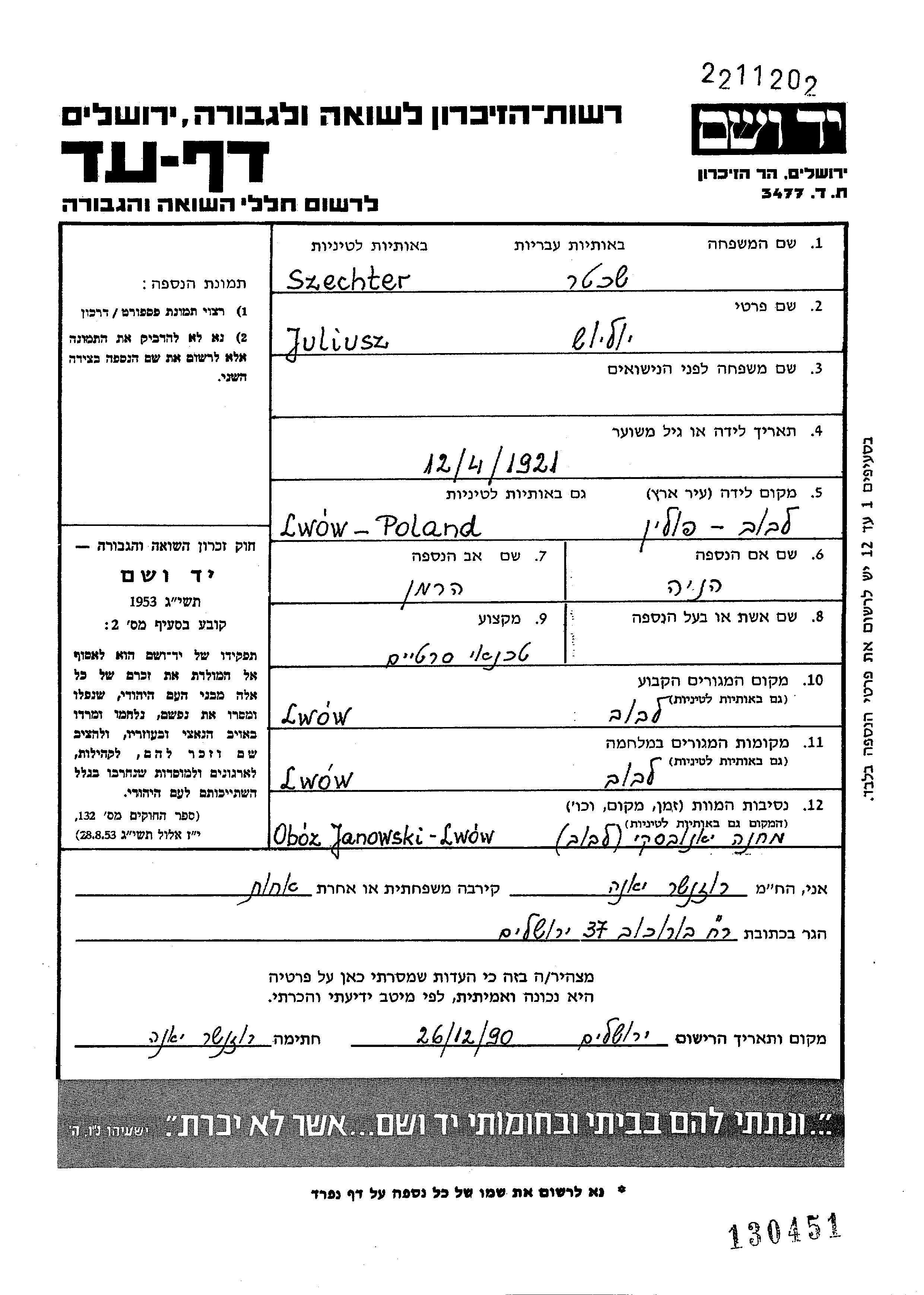 Юлиуш Шехтер, место рождения: Львов, Польша. Отец: Херман, mать:Хеня, девичья фамилия Нойман. Техник. Место жительства до войны: Львов, Польша. Место во время войны: Львов, Польша.