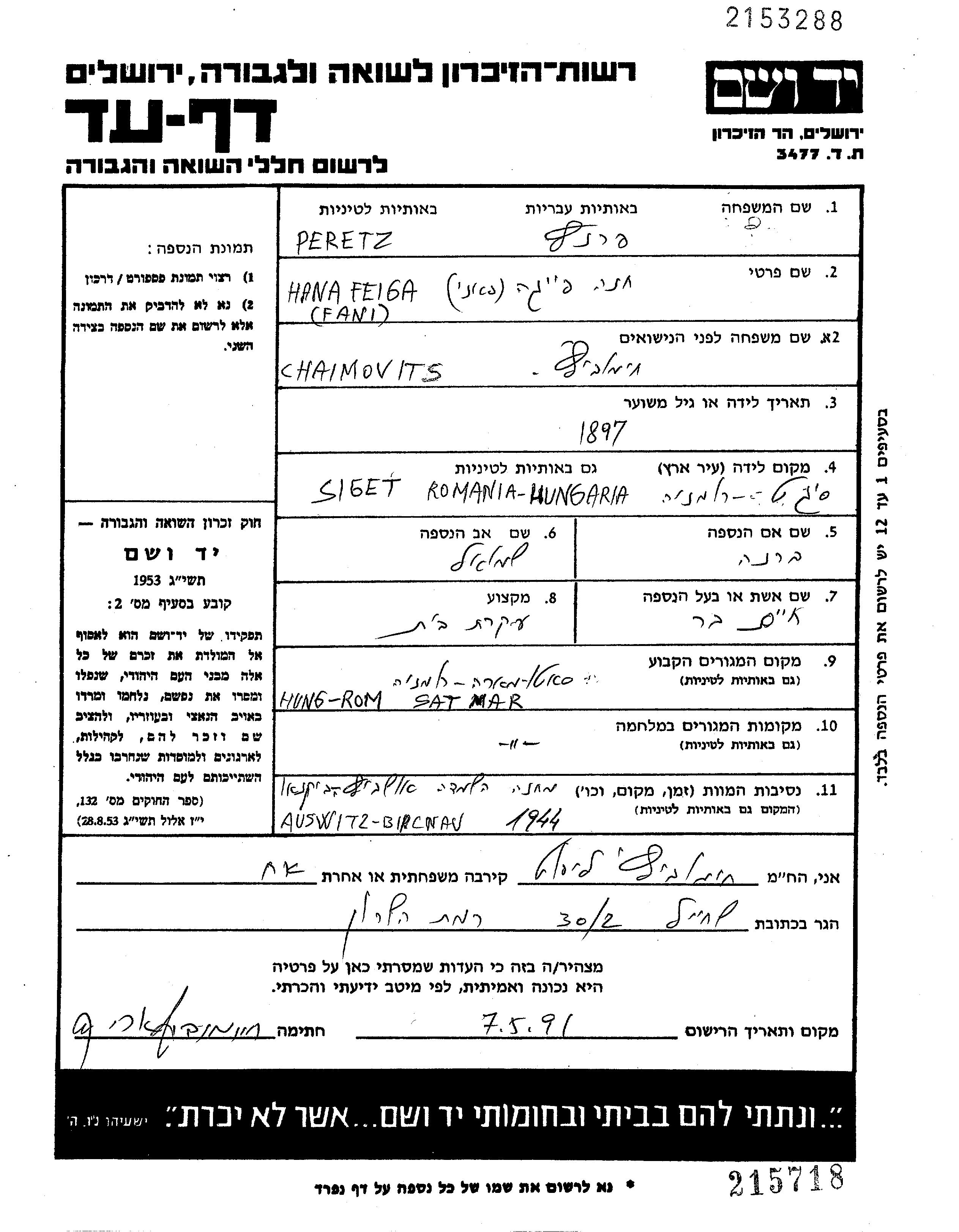Хана Фани Фейга Перец Франц, девичья фамилия Хаимовиц, место рождения: Сигет, Румыния. Отец: Шмуэль, mать:Брана. Домохозяйка. Женат / замужем. Место жительства до войны: Сату-Маре, Румыния. Место во время войны: Сату-Маре, Румыния.