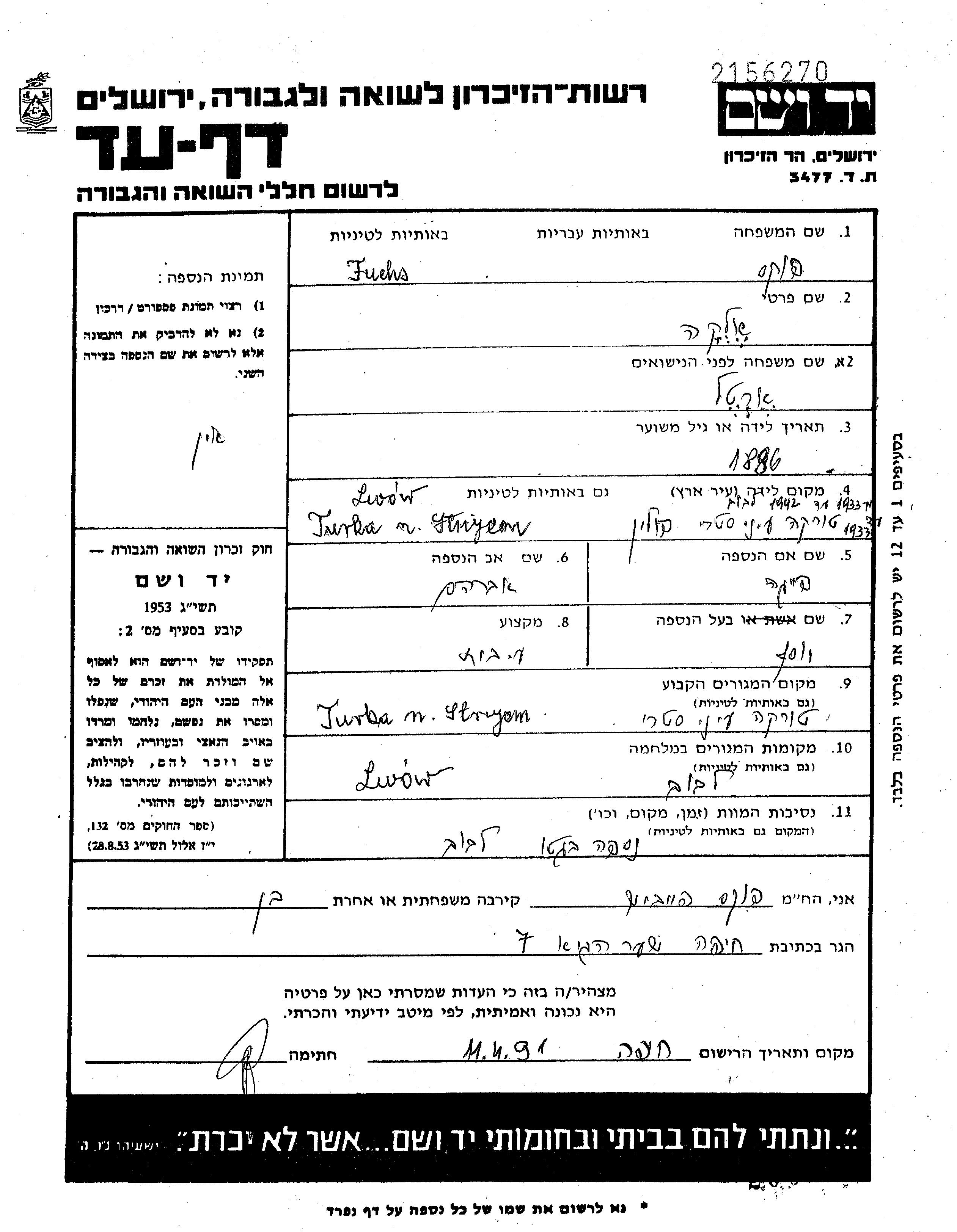 Элка Фухс, девичья фамилия Эртель, место рождения: Львов, Польша. Отец: Авраам, mать:Фейга. Домохозяйка. Женат / замужем. Место жительства до войны: Турка Над Стрыем, Польша. Место во время войны: Львов, Польша.