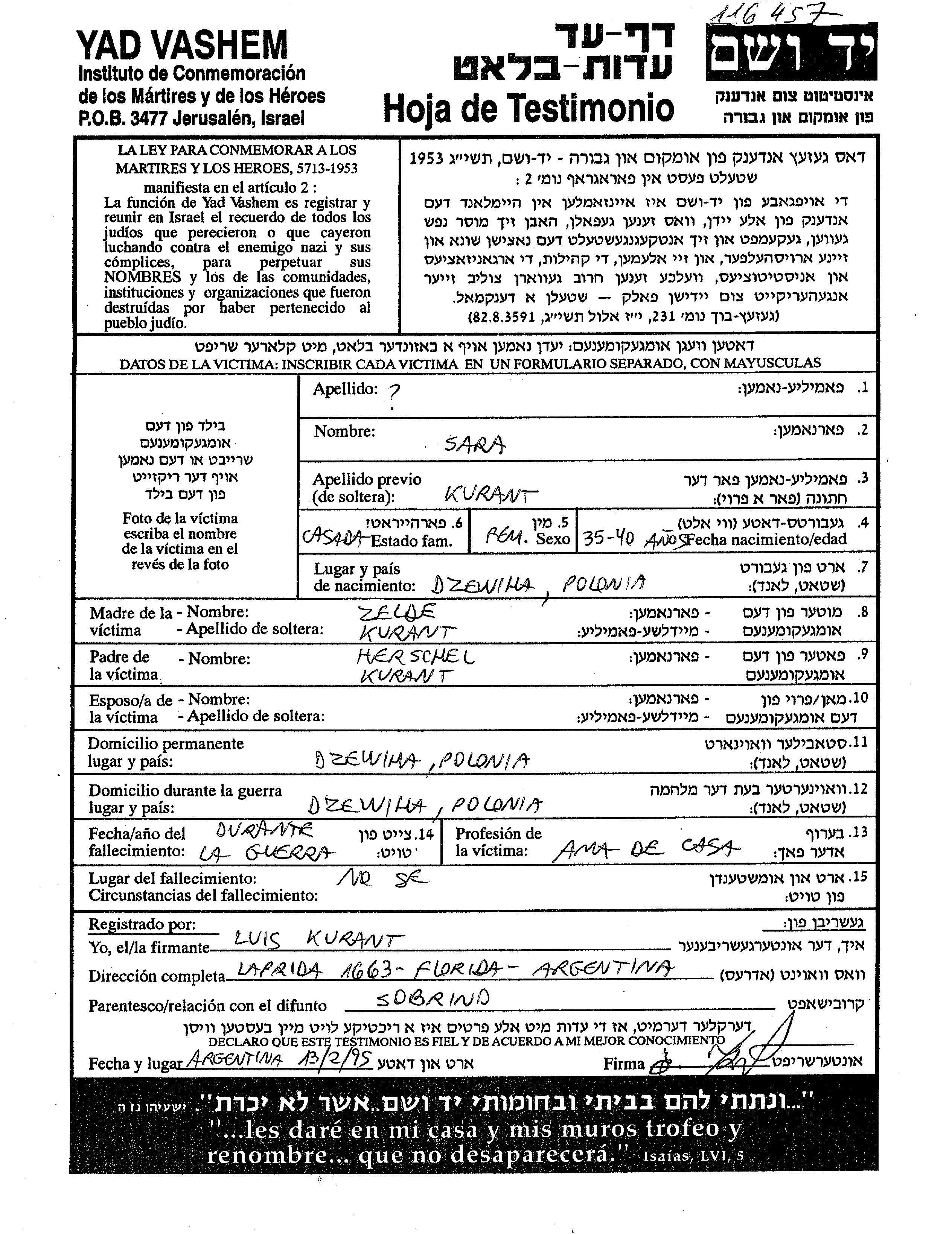 Сара Фамилия неизвестна, девичья фамилия Курант, место рождения: Джевица, Польша. Отец: Хершель, mать:Зельде. Домохозяйка. Женат / замужем. Место жительства до войны: Джевица, Польша. Место во время войны: Джевица, Польша.