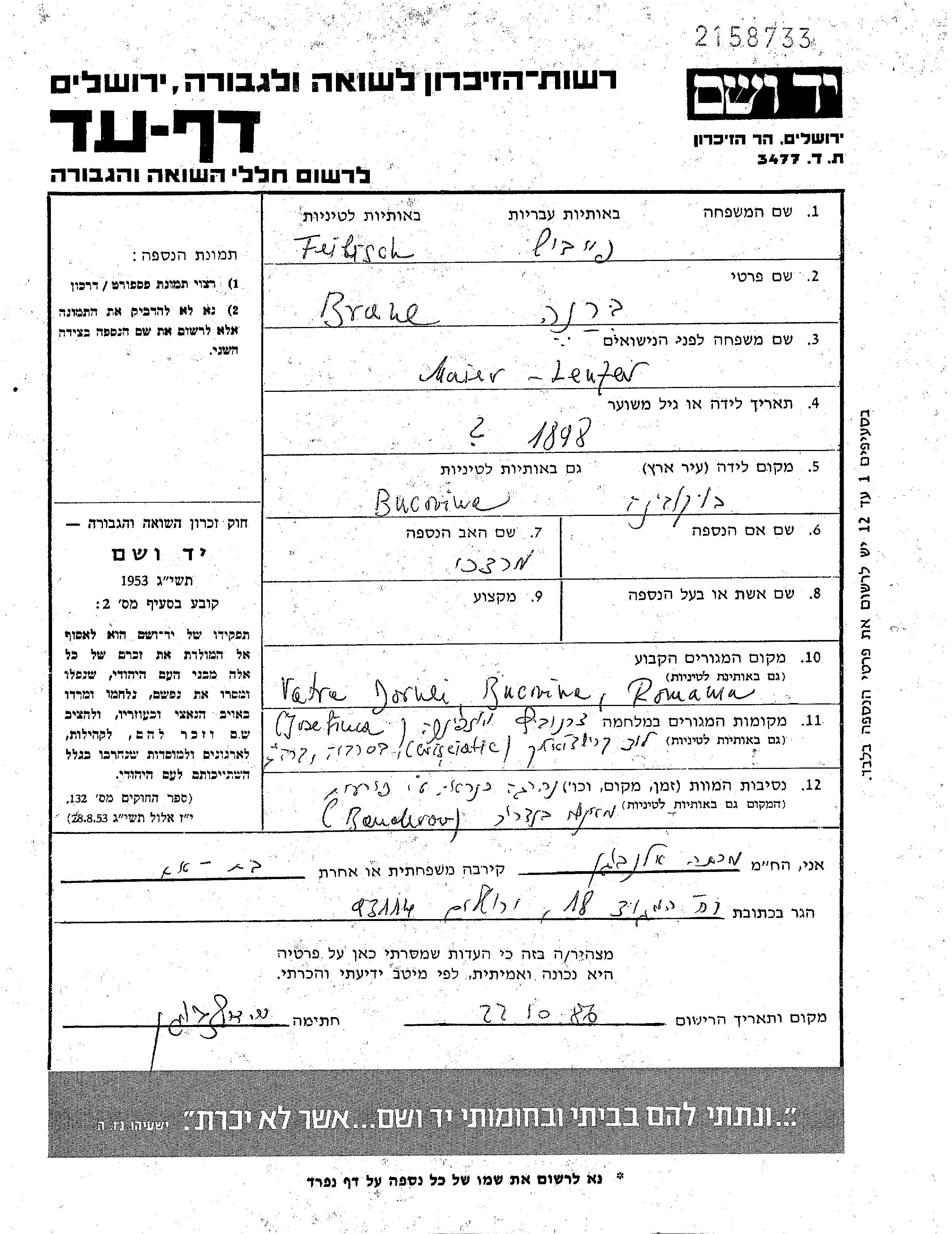 Бране Фейбиш, девичья фамилия Маер, место рождения: Буковина, Румыния. Женат / замужем. Место жительства до войны: Ватра Дорней, Румыния. Место во время войны: Черновцы, Румыния.