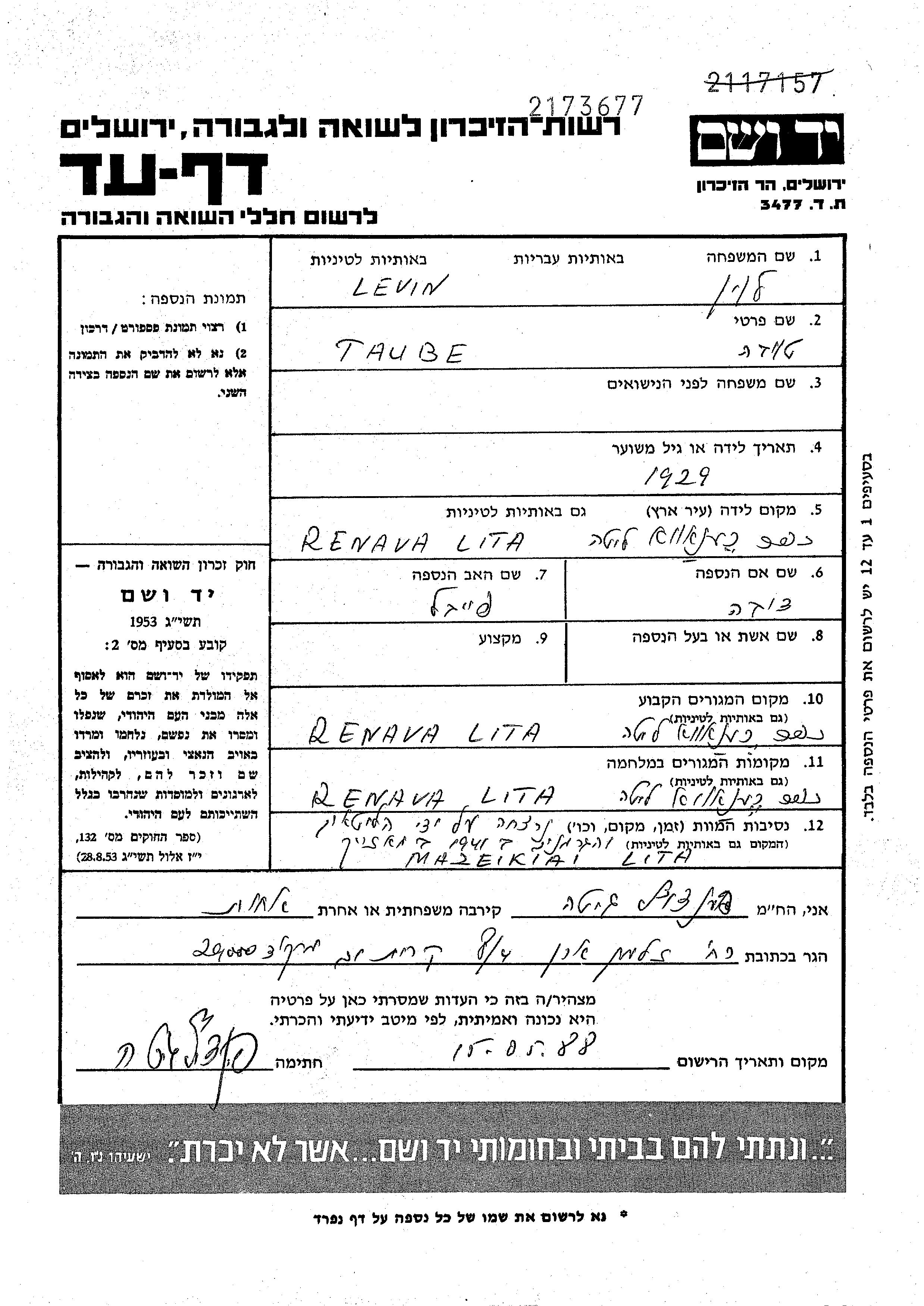 Тауба Левин, место рождения: Ренавас, Литва. Отец: Файвел, mать:Доба, девичья фамилия Ципин. Ребенок. Место жительства до войны: Ренавас, Литва. Место во время войны: Ренавас, Литва.