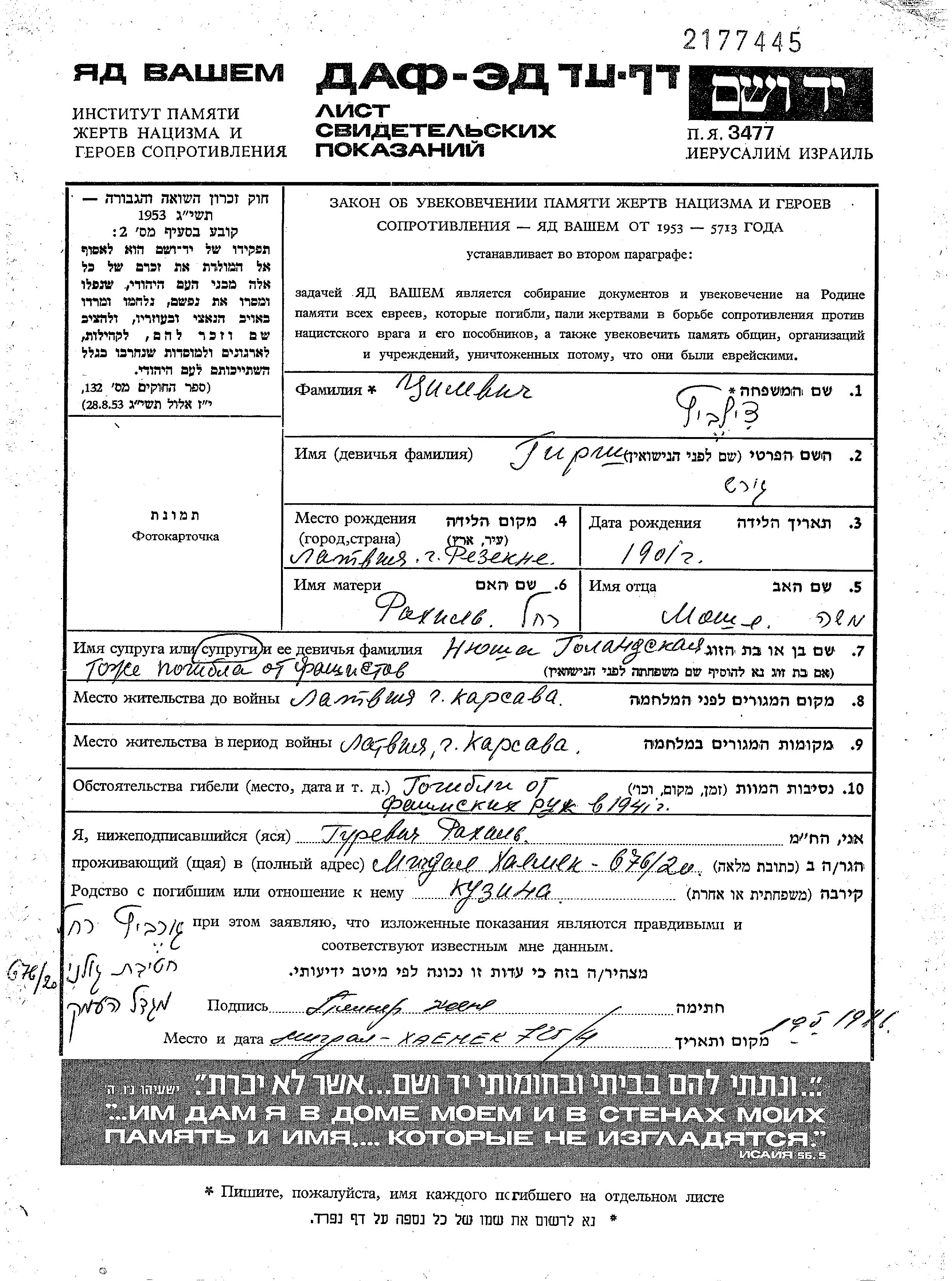 Яд Вашем - Листы свидетельских показаний Мемориального фонда