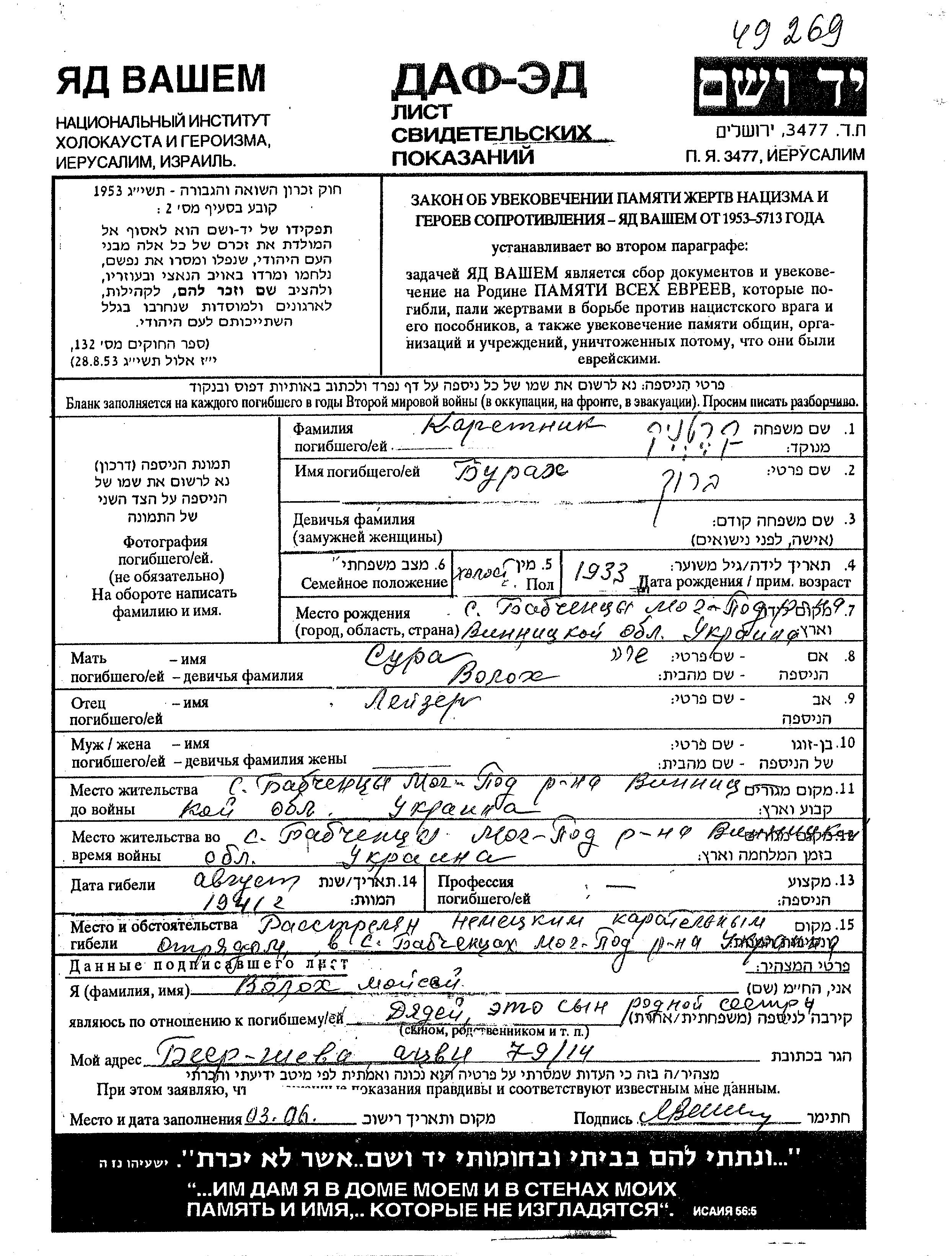 Яд Вашем - Листы свидетельских показаний Мемориального фонда