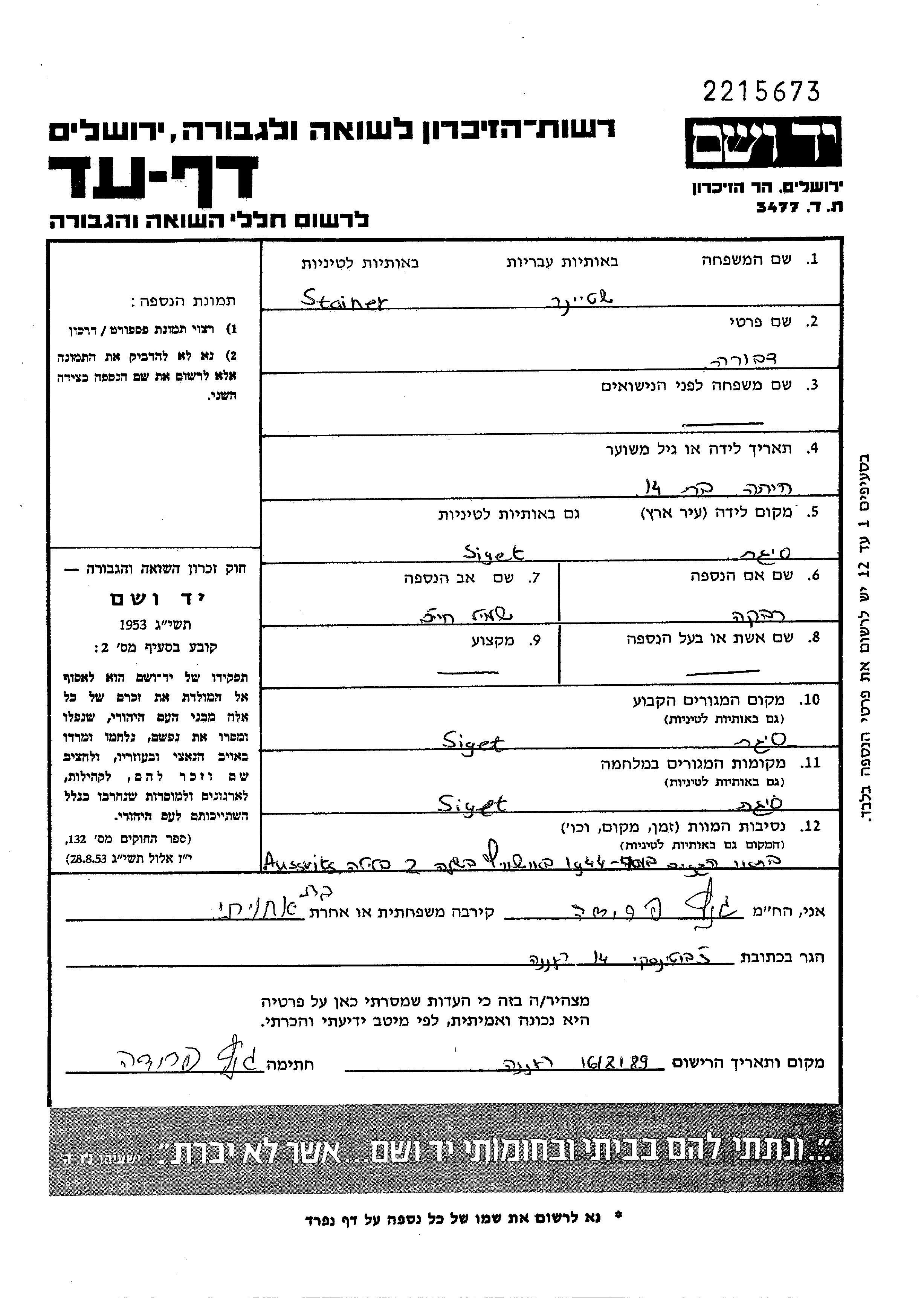 Штайнер Двора Сигет, Румыния Лист свидетельских показаний