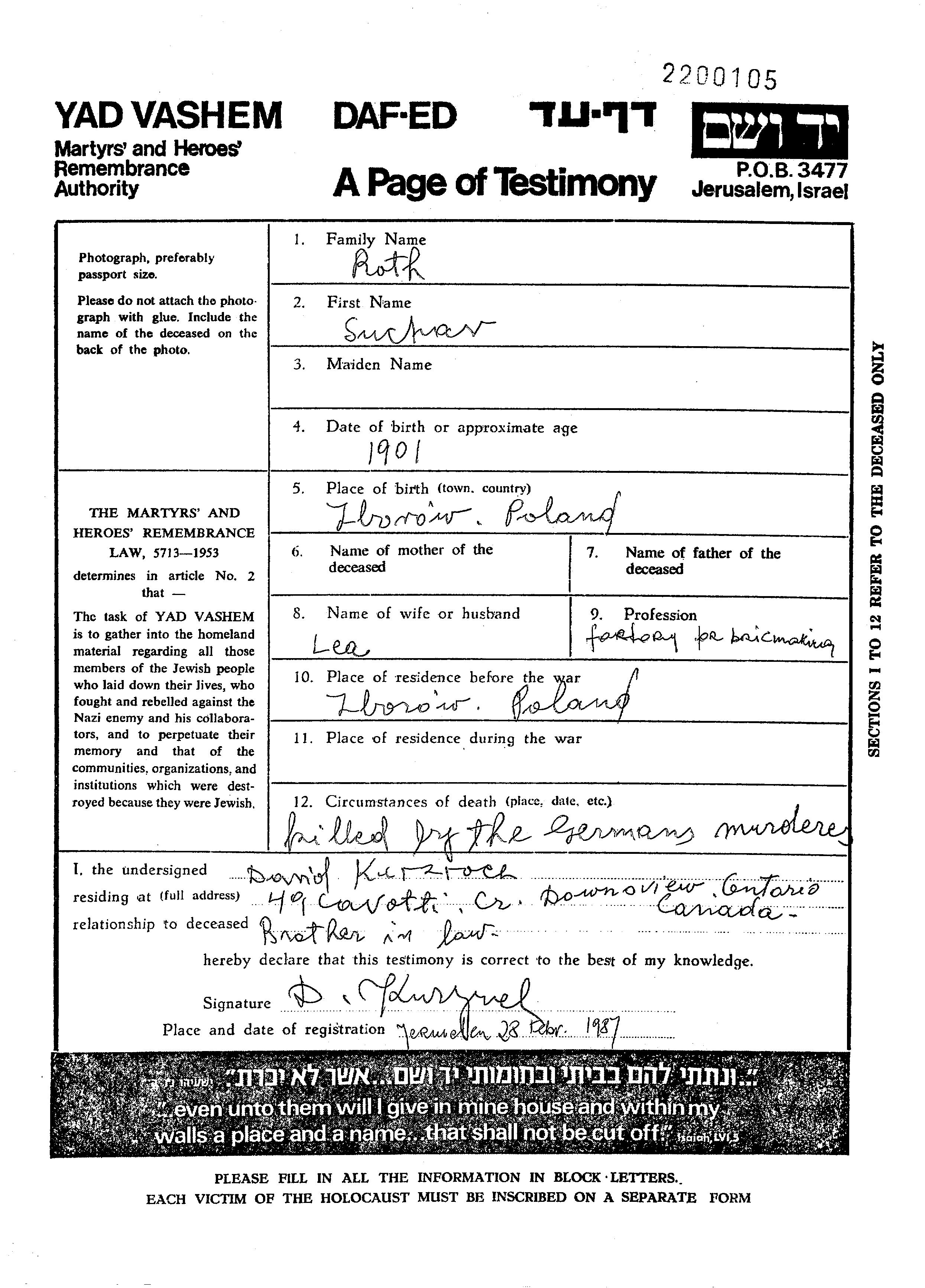 Рот Рут Сухар 1901 Зборов, Польша Лист свидетельских показаний
