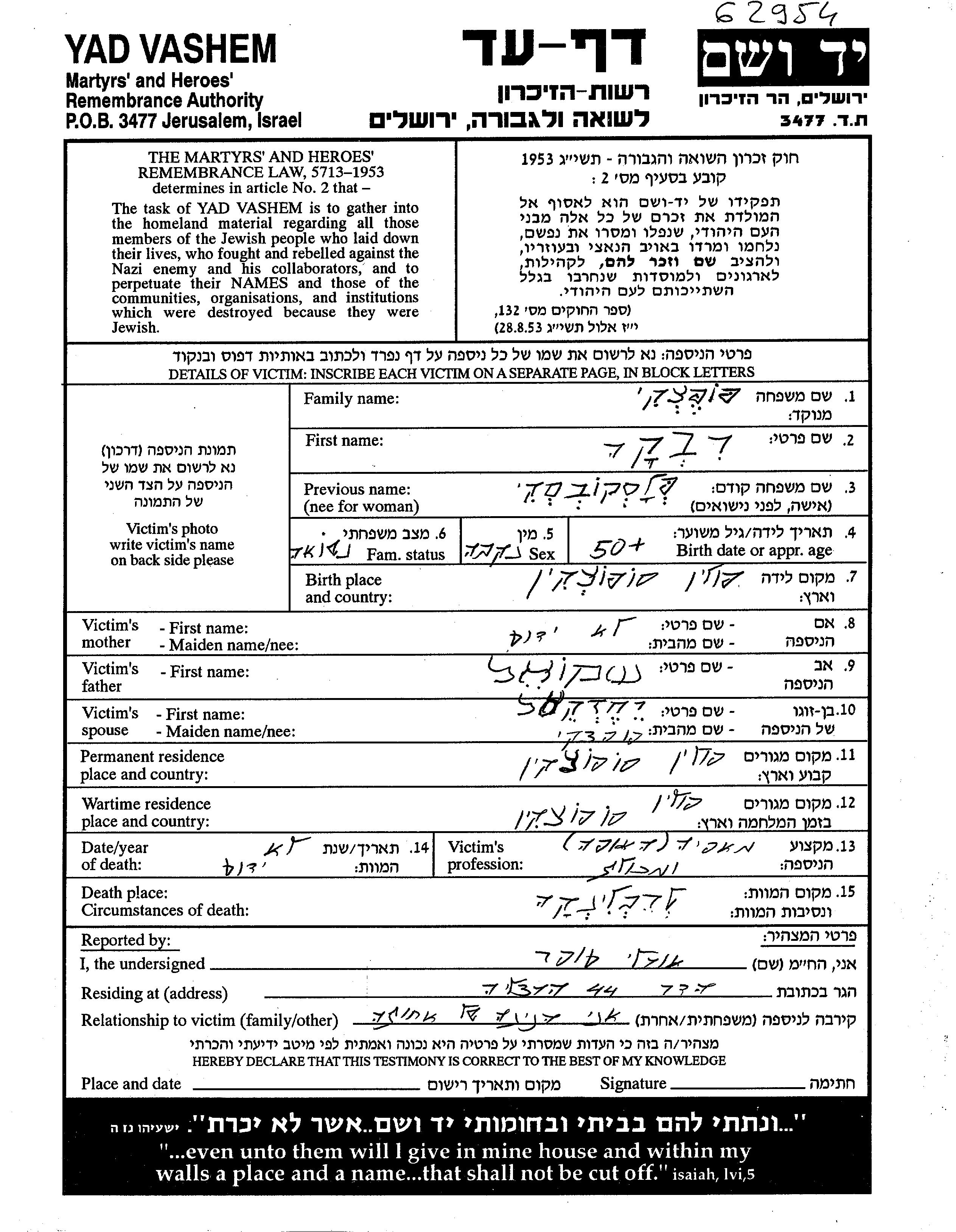 Яд Вашем - Листы свидетельских показаний Мемориального фонда