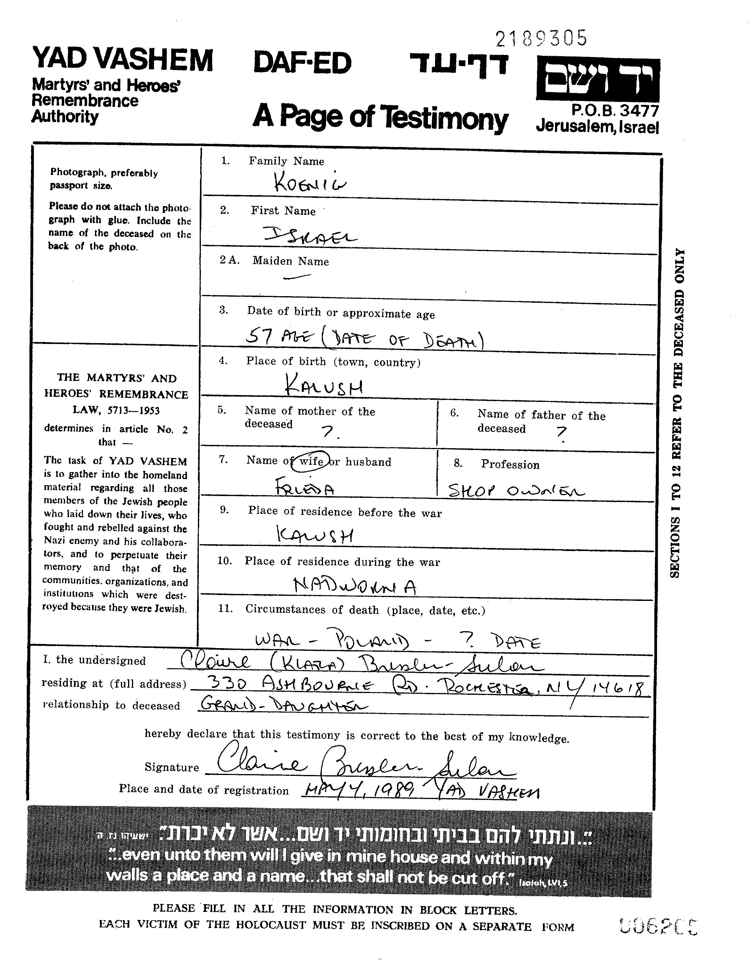 Кёниг Исраэль Калуш, Польша Лист свидетельских показаний