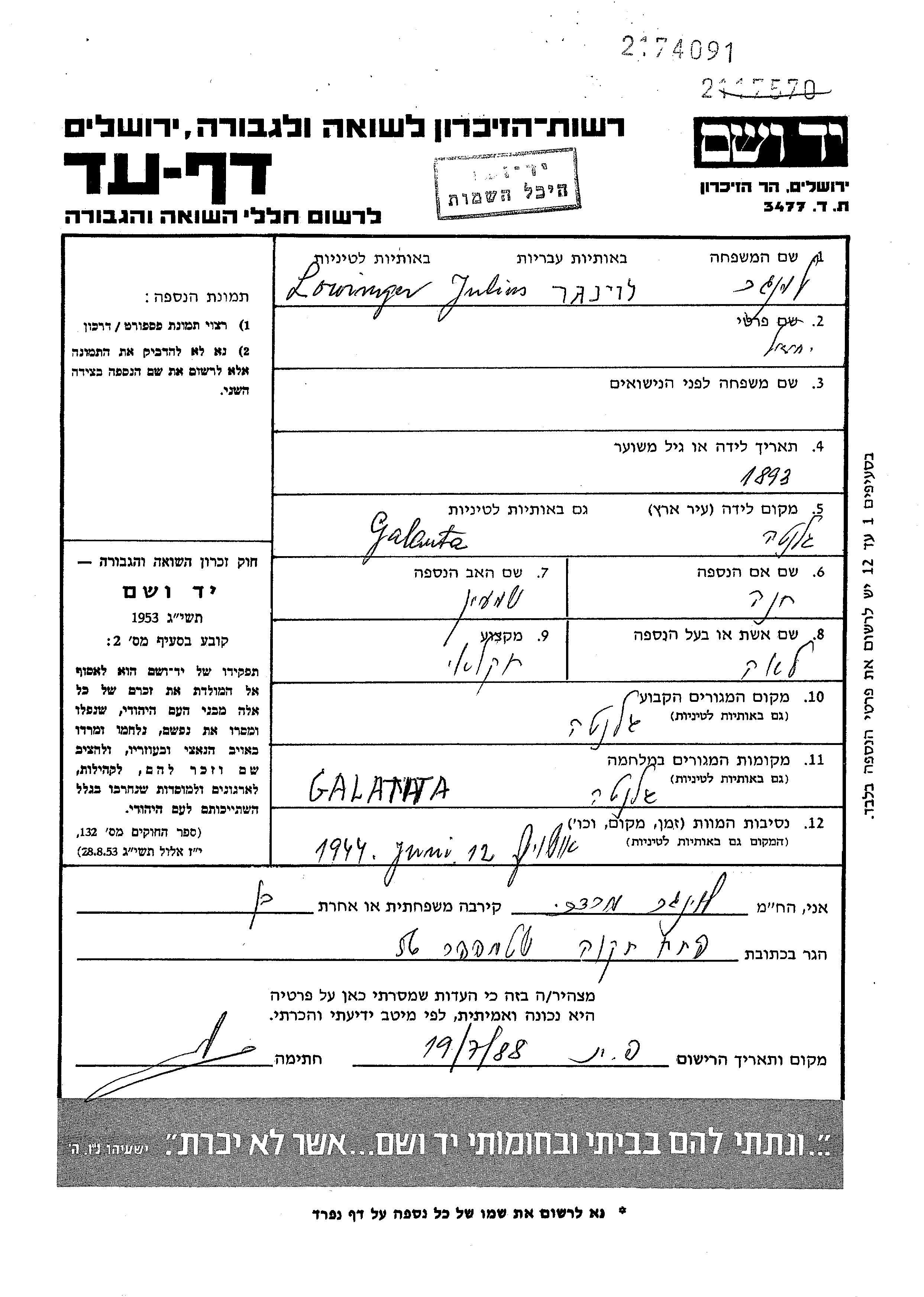 Юлиус Иехиэль Лёвингер, место рождения: Галанта, Чехословакия. Отец: Шимон, mать:Хана. Земледелец / земледелица. Женат / замужем. Место жительства до войны: Галанта, Чехословакия. Место во время войны: Галанта, Чехословакия.