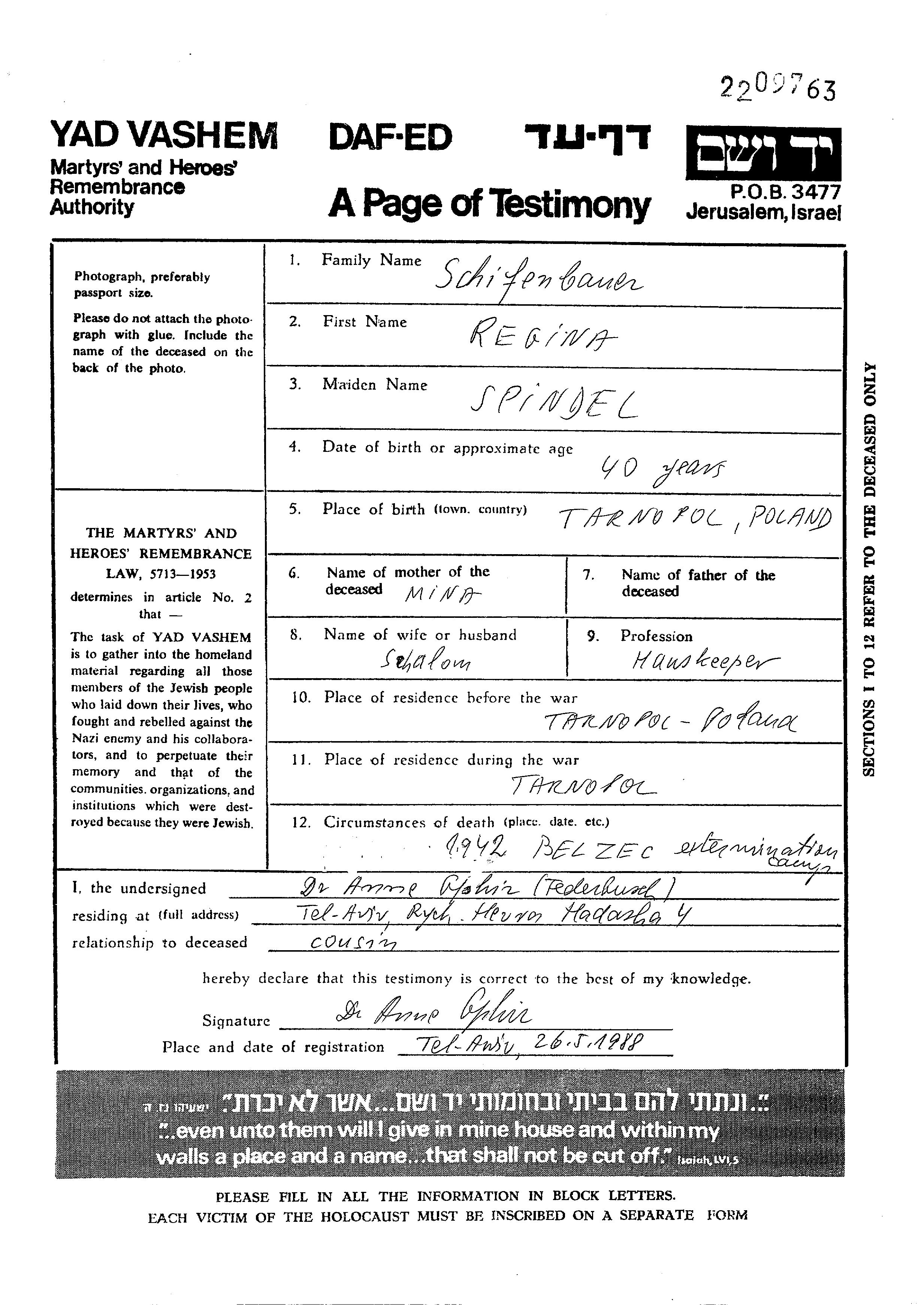 Шифенбауэр Регина Тарнополь, Польша Лист свидетельских показаний