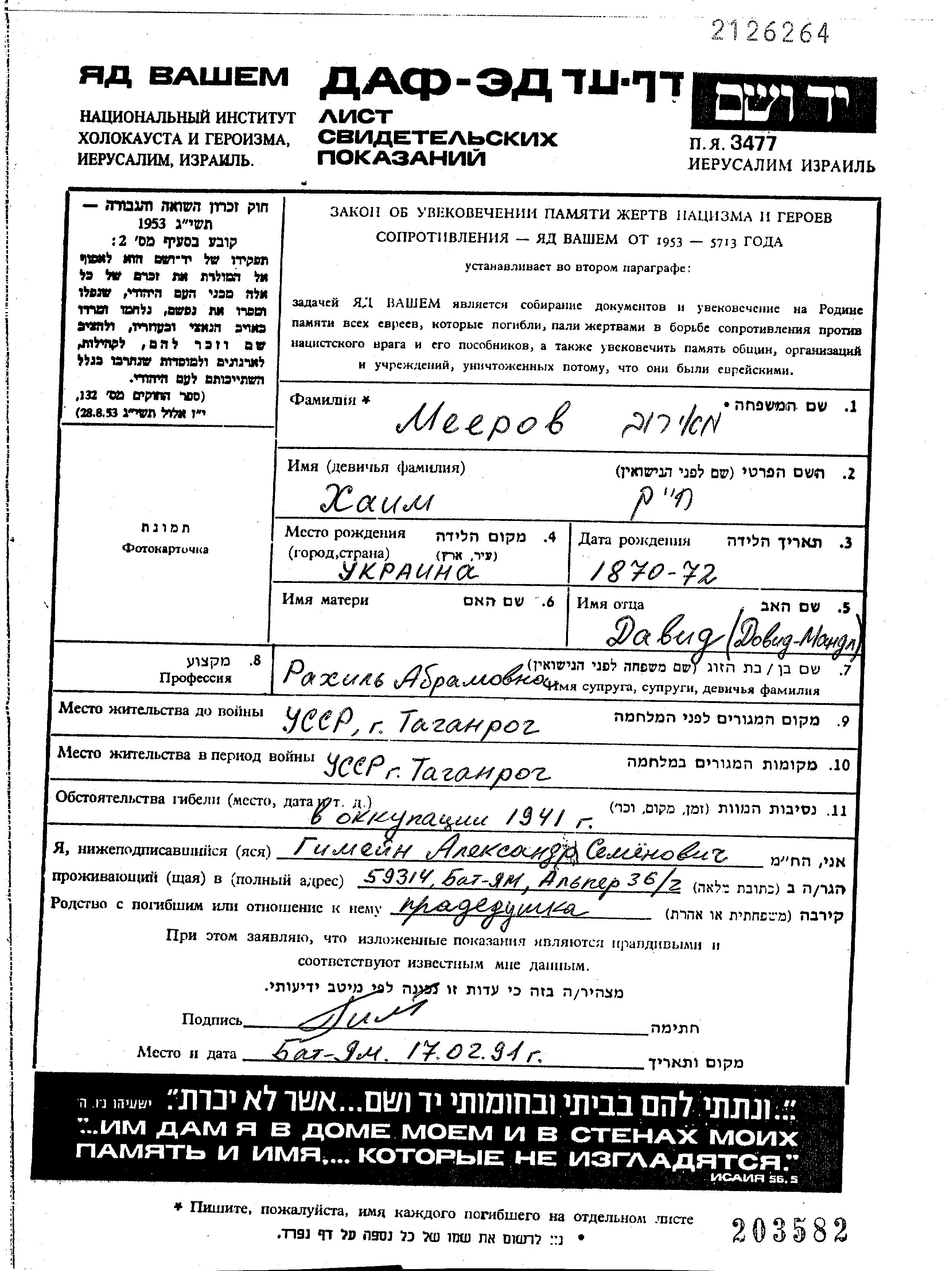Хаим Мееров, место рождения: Украина (СССР). Отец: Довид Мандл. Женат / замужем. Место жительства до войны: Таганрог, Россия (СССР). Место во время войны: Таганрог, Россия (СССР).