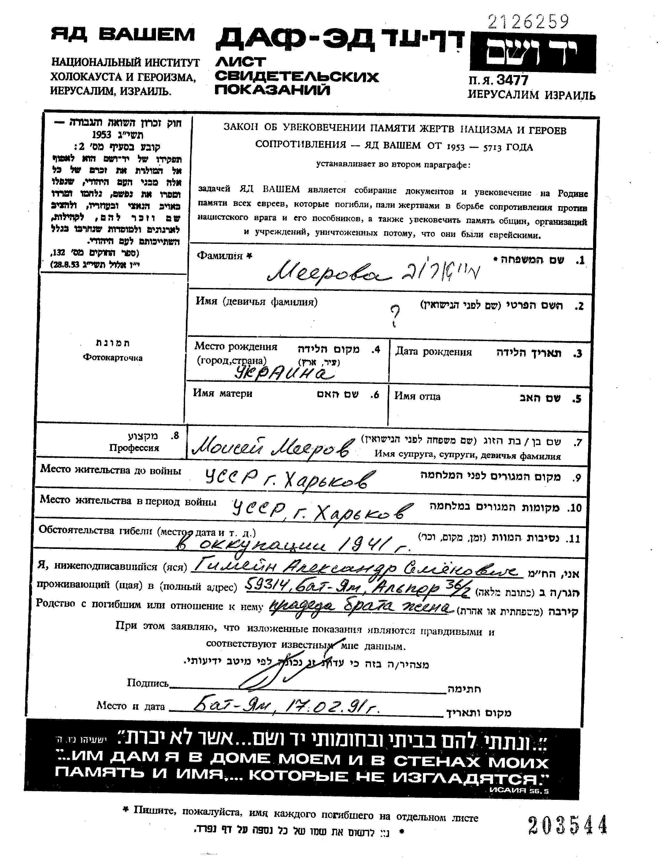 Мееров Имя неизвестно Харьков, Украина (СССР) Лист свидетельских показаний