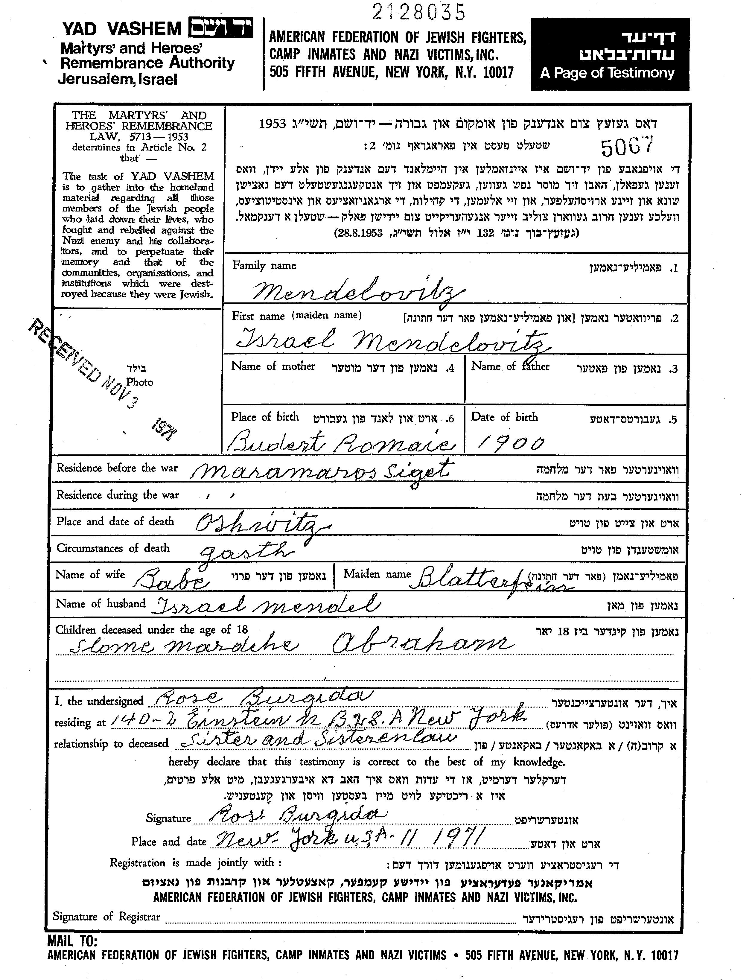 Менделовиц Исраэль 1900 Марамарошсигет, Румыния Лист свидетельских показаний
