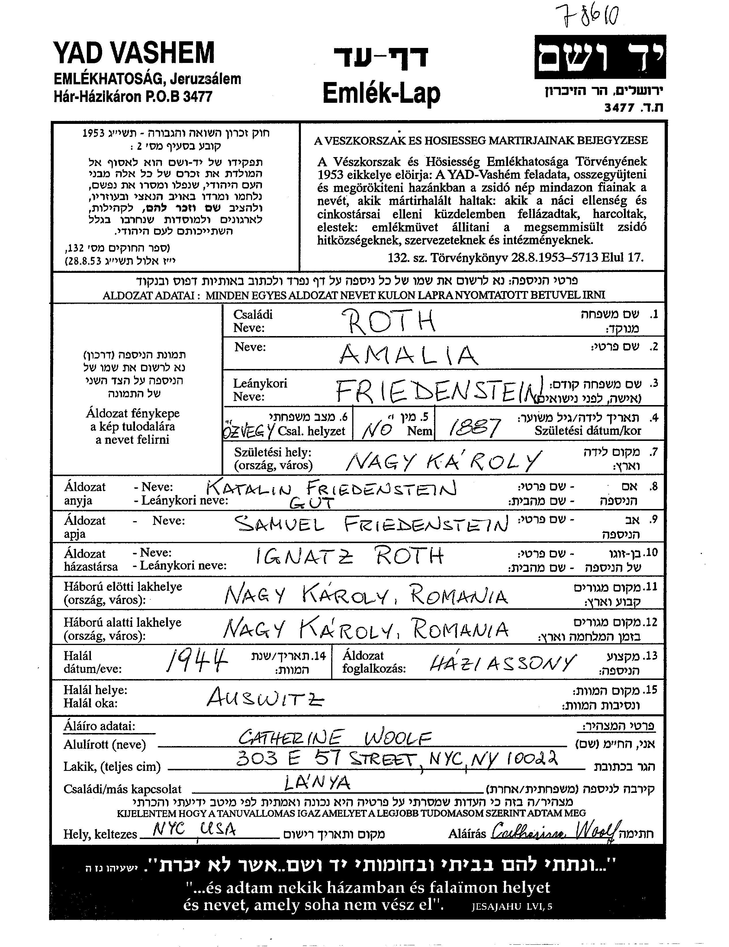 Амалия Рот Рут, девичья фамилия Фриденштайн, место рождения: Надькарой, Румыния. Отец: Шмуэль, mать:Каталин, девичья фамилия Гут. Домохозяйка. Вдовец / вдова. Место жительства до войны: Надькарой, Румыния. Место во время войны: Надькарой, Румыния.
