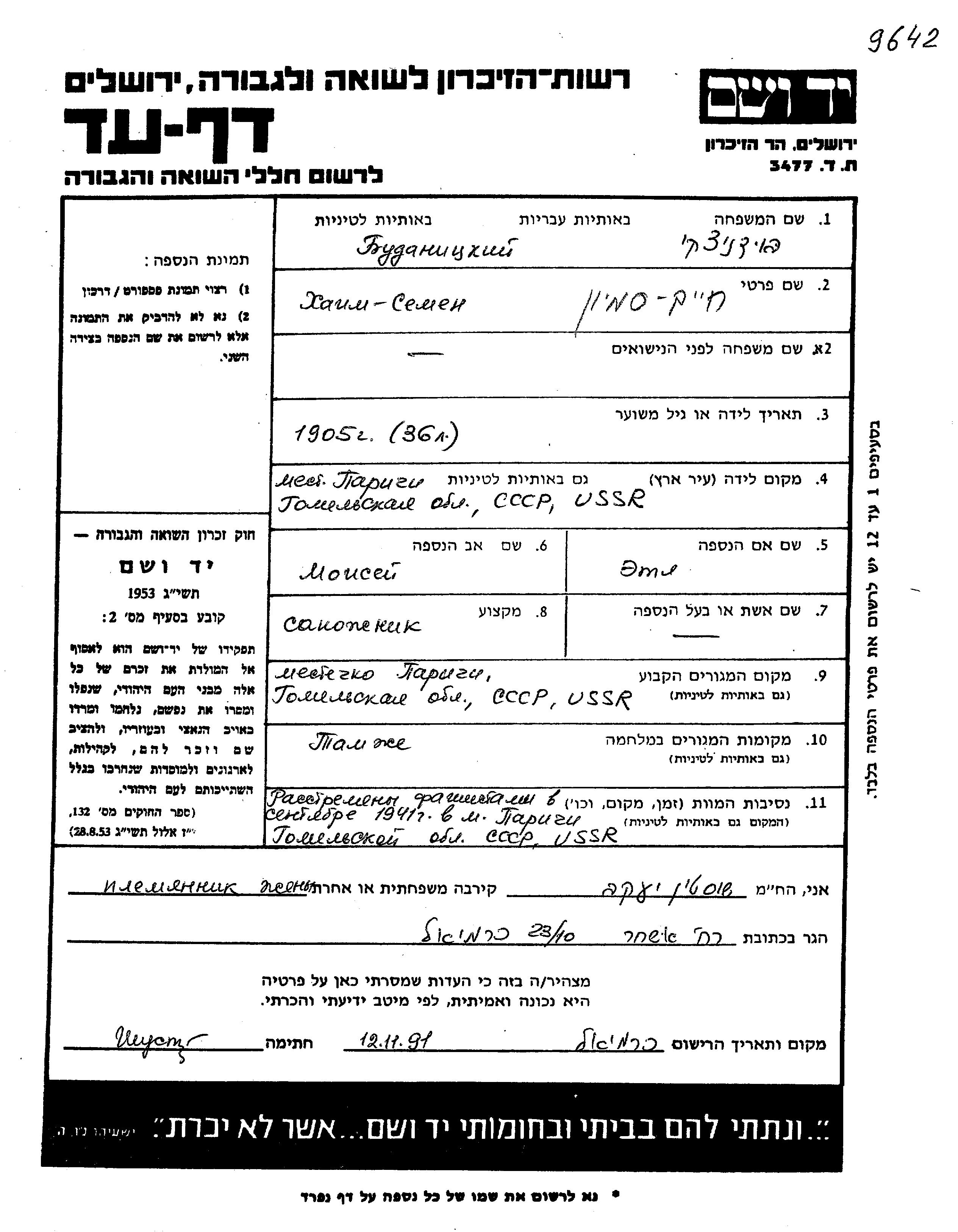 Хаим Семён Буданицкий Будницкий, место рождения: Паричи, Белоруссия (СССР). Отец: Моисей, mать:Этл. Сапожник. Женат / замужем. Место жительства до войны: Паричи, Белоруссия (СССР). Место во время войны: Паричи, Белоруссия (СССР).