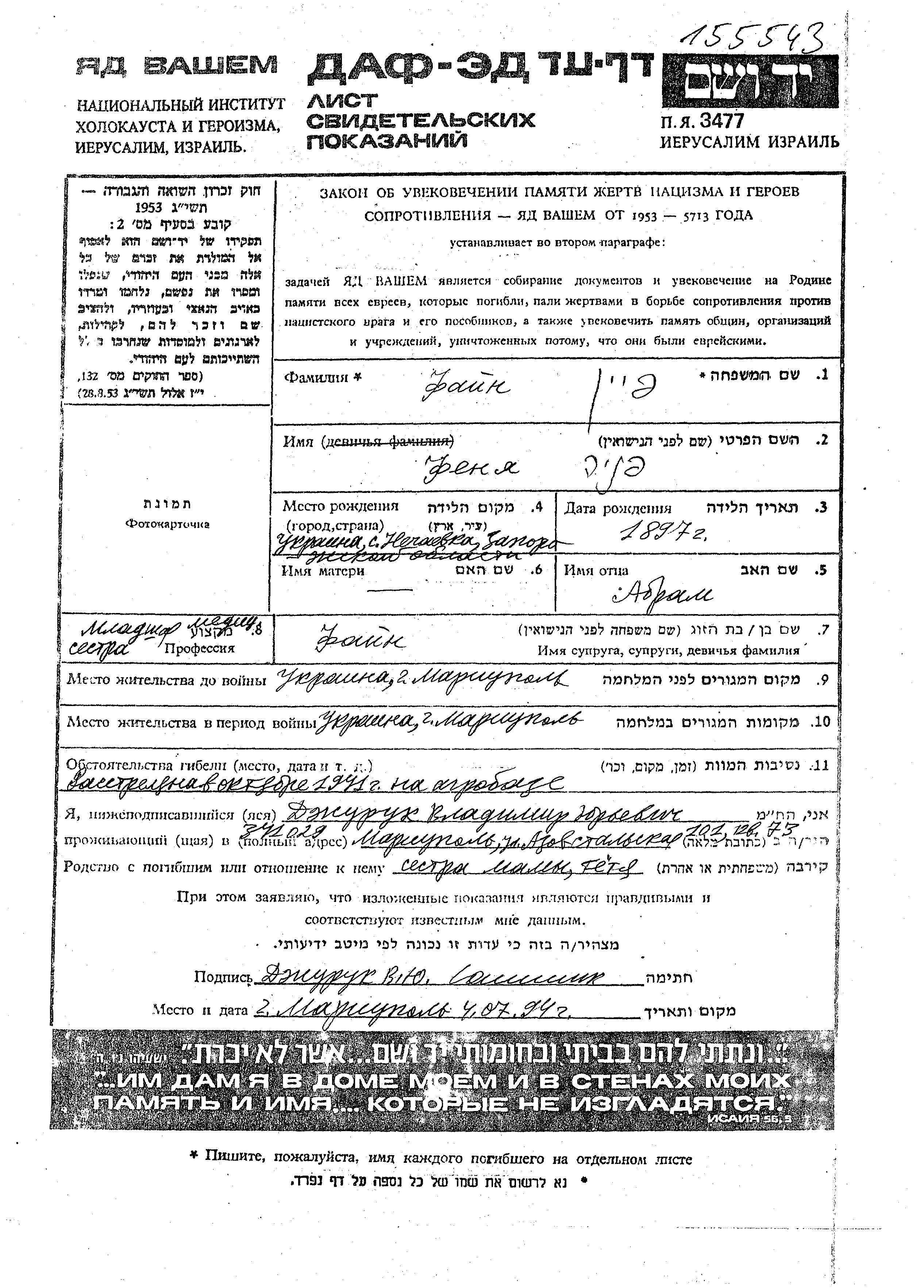 Файн Феня 1897 Мариуполь, Украина (СССР) Лист свидетельских показаний