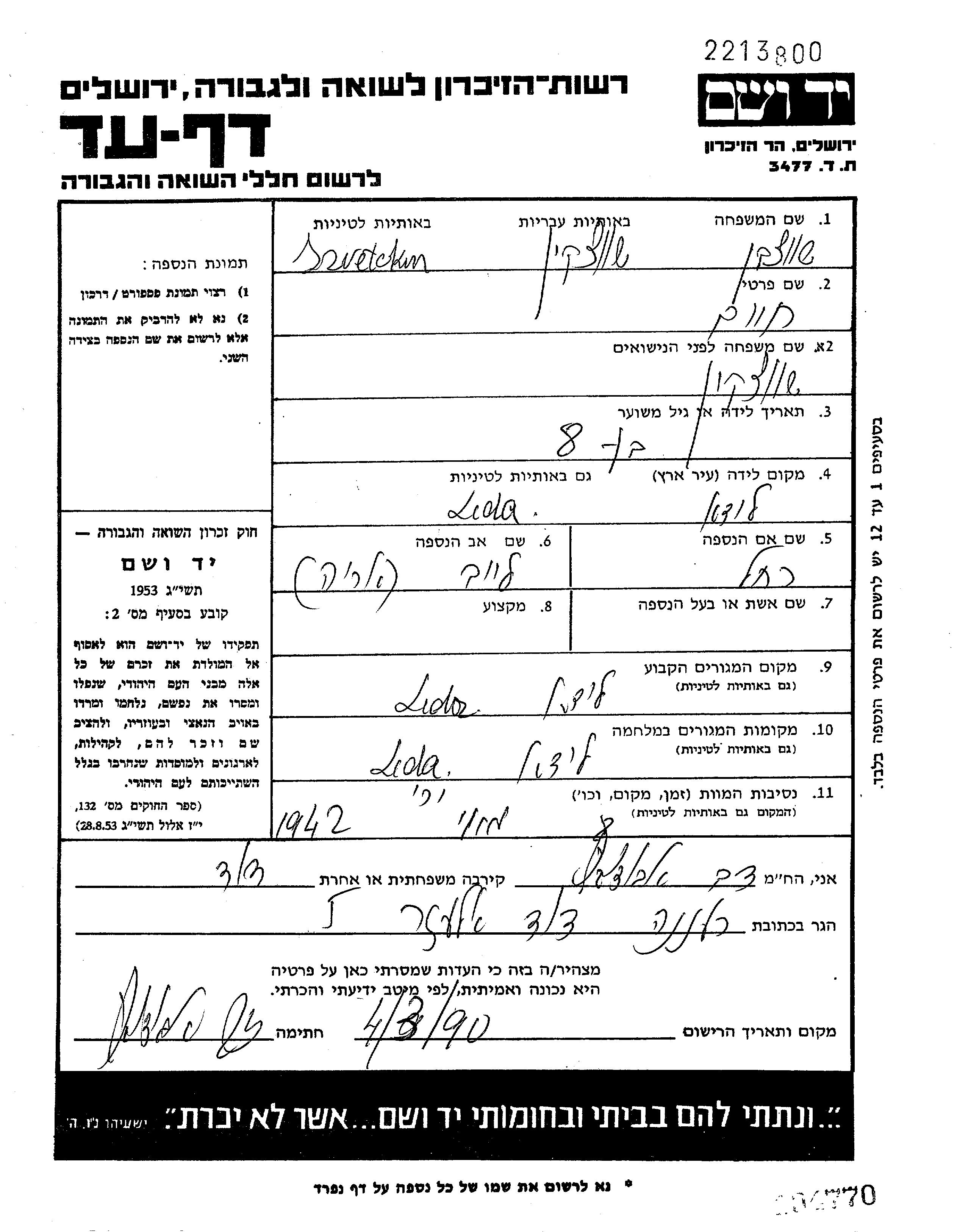 Хаим Швецкин, место рождения: Лида, Польша. Отец: Лейб Арье, mать:Рахель, девичья фамилия Абодовиц. Ребенок. Место жительства до войны: Лида, Польша. Место во время войны: Лида, Польша.