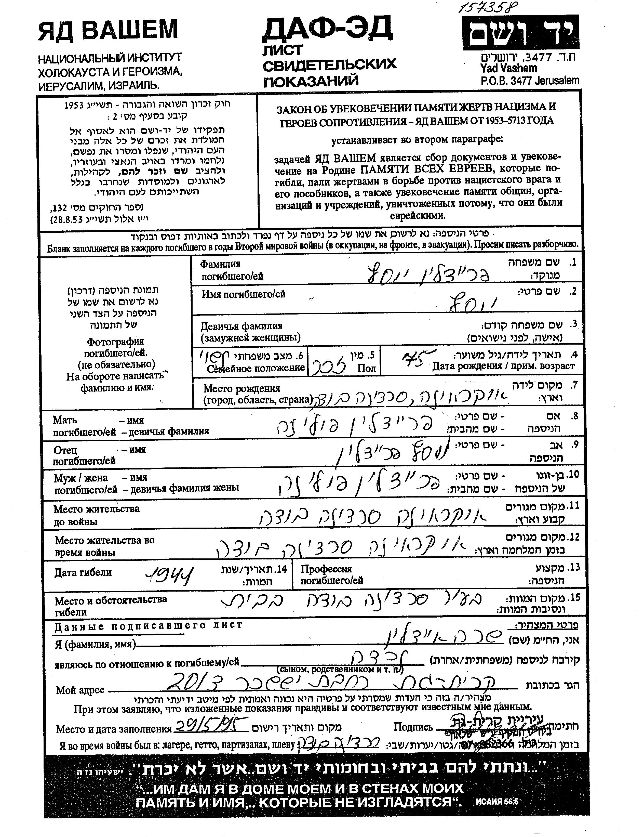 Яд Вашем - Листы свидетельских показаний Мемориального фонда