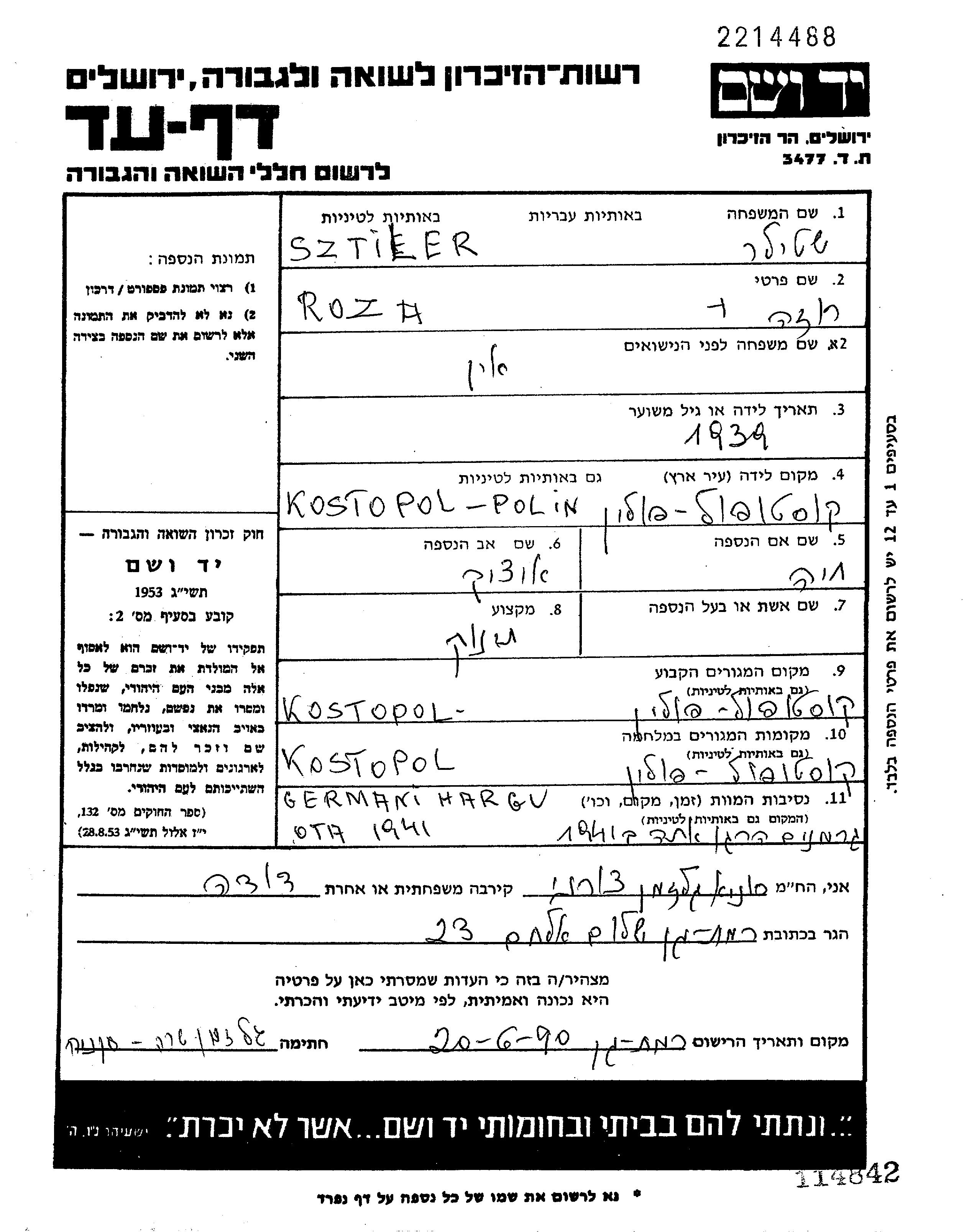 Штилер Роза Костополь, Польша Лист свидетельских показаний