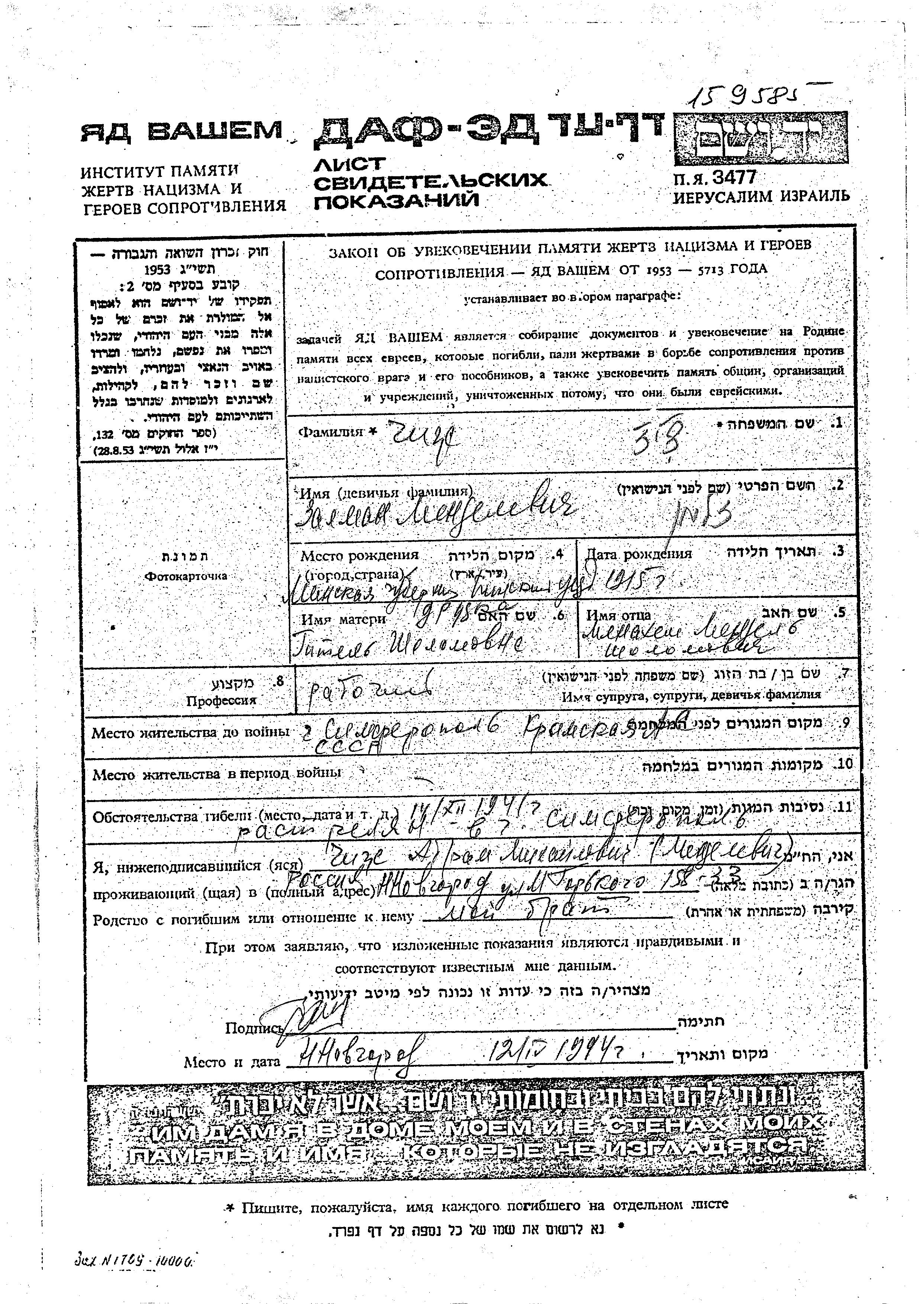 Яд Вашем - Листы свидетельских показаний Мемориального фонда