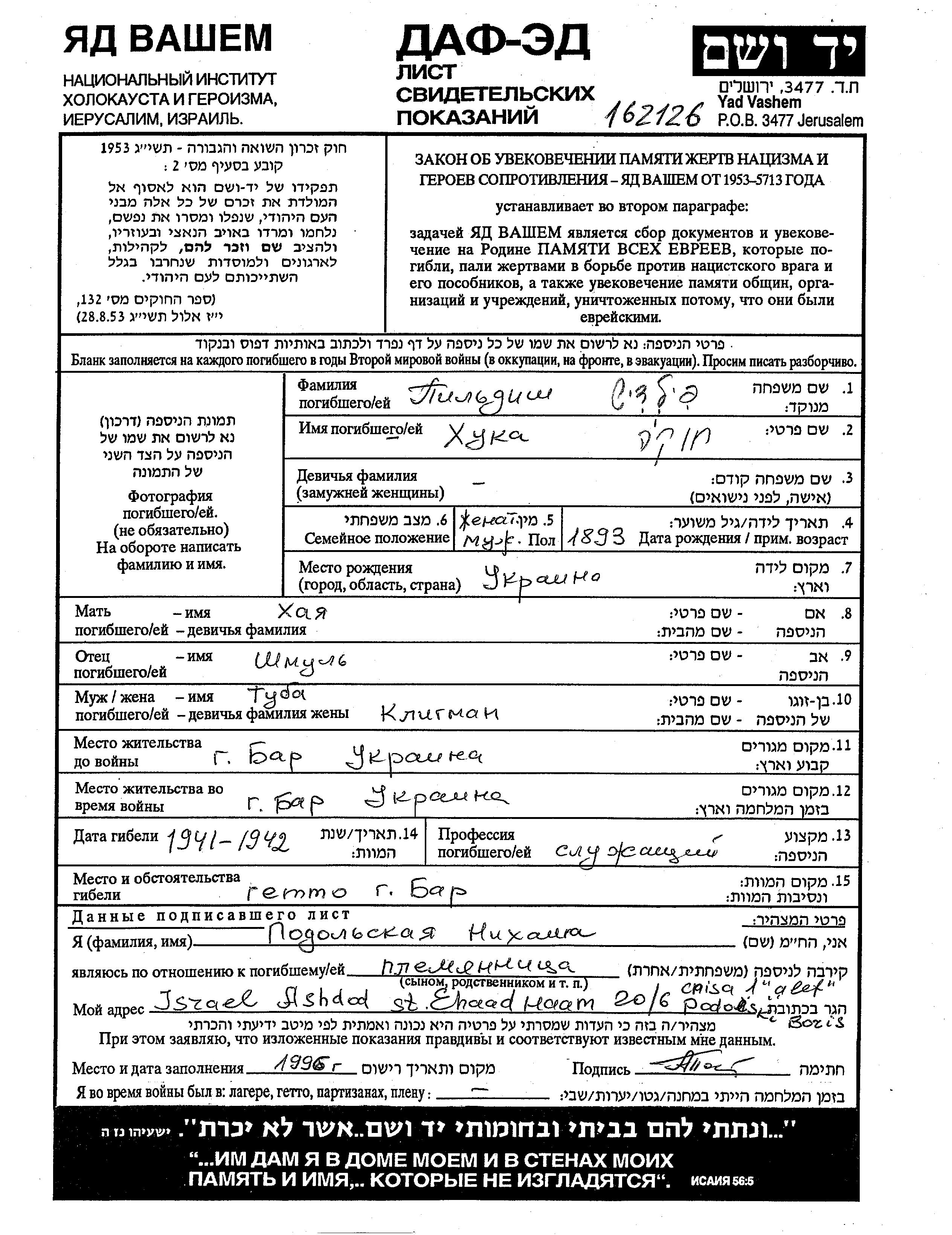Хука Пильдиш, место рождения: Украина (СССР). Отец: Шмуль, mать:Хая. Клерк. Женат / замужем. Место жительства до войны: Бар, Украина (СССР). Место во время войны: Бар, Украина (СССР).