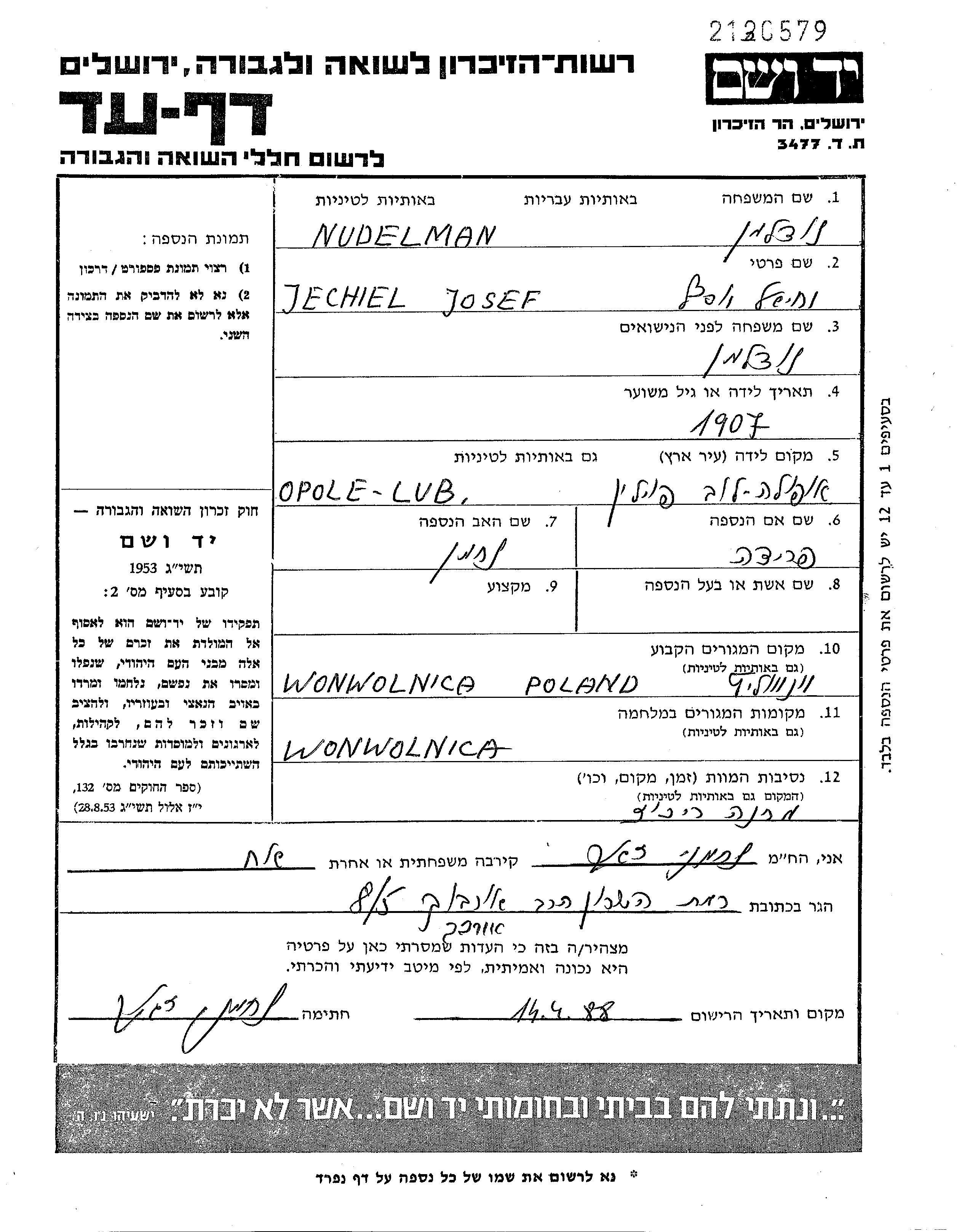 Ехиель Йосеф Нудельман, место рождения: Ополе-Любельске, Польша. Отец: Нахман, mать:Фрида, девичья фамилия Шерман. Место жительства до войны: Вонвольница, Польша. Место во время войны: Вонвольница, Польша.