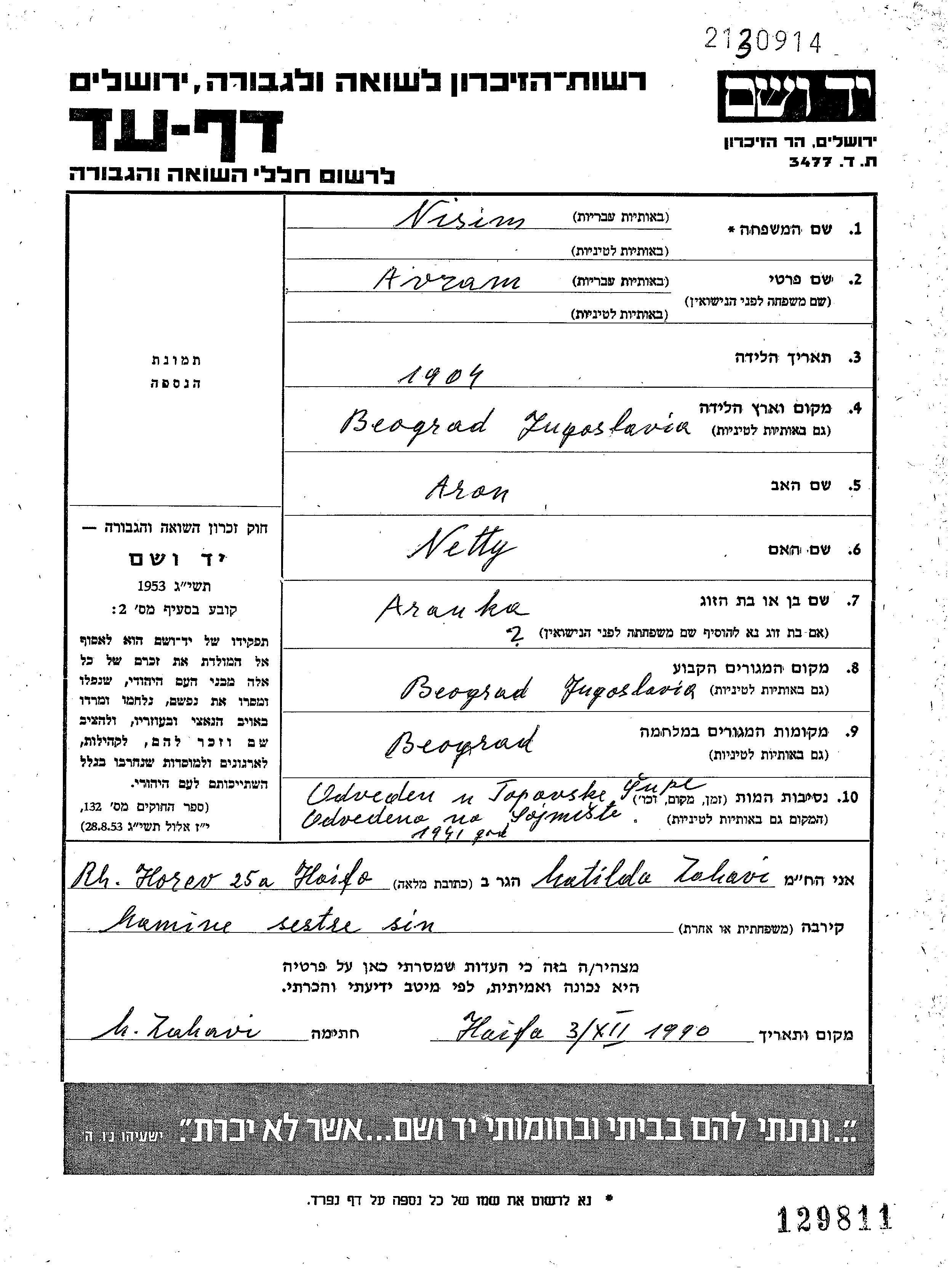 Нисим Аврам 1904 Белград, Югославия Лист свидетельских показаний