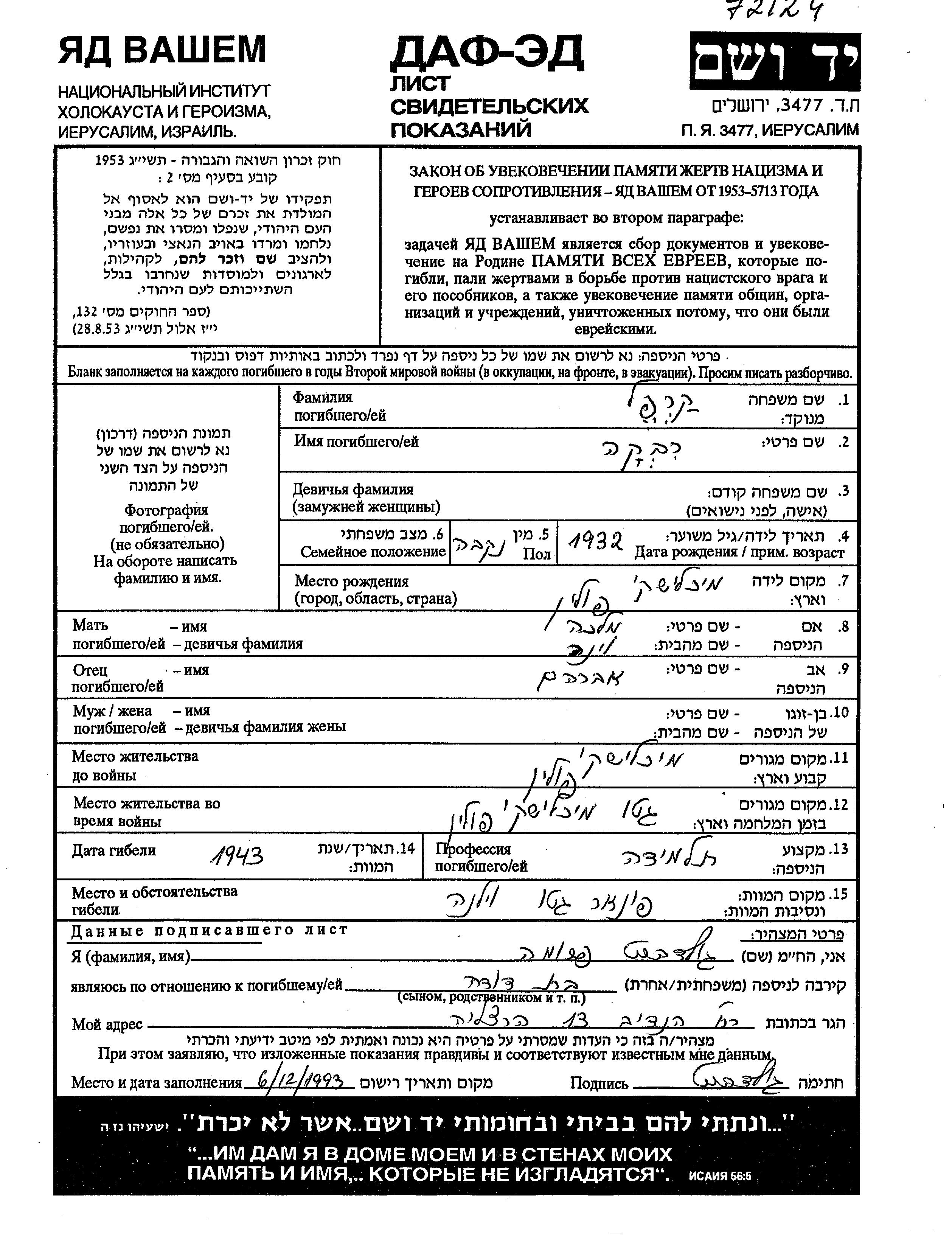 Яд Вашем - Листы свидетельских показаний Мемориального фонда
