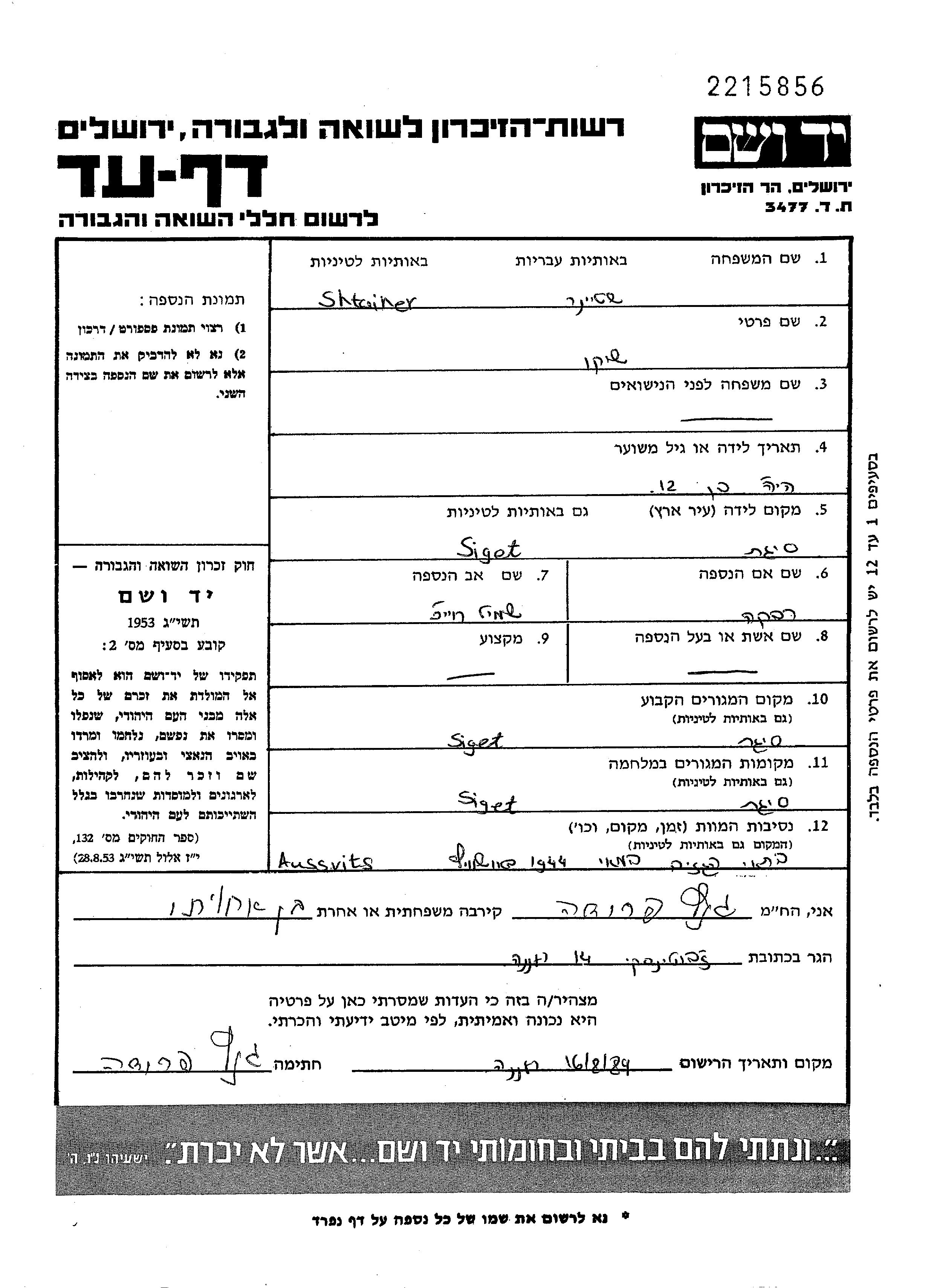 Шико Штайнер, место рождения: Сигет, Румыния. Отец: Шмиль Хаим, mать:Ривка, девичья фамилия Апель. Ребенок. Место жительства до войны: Сигет, Румыния. Место во время войны: Сигет, Румыния.