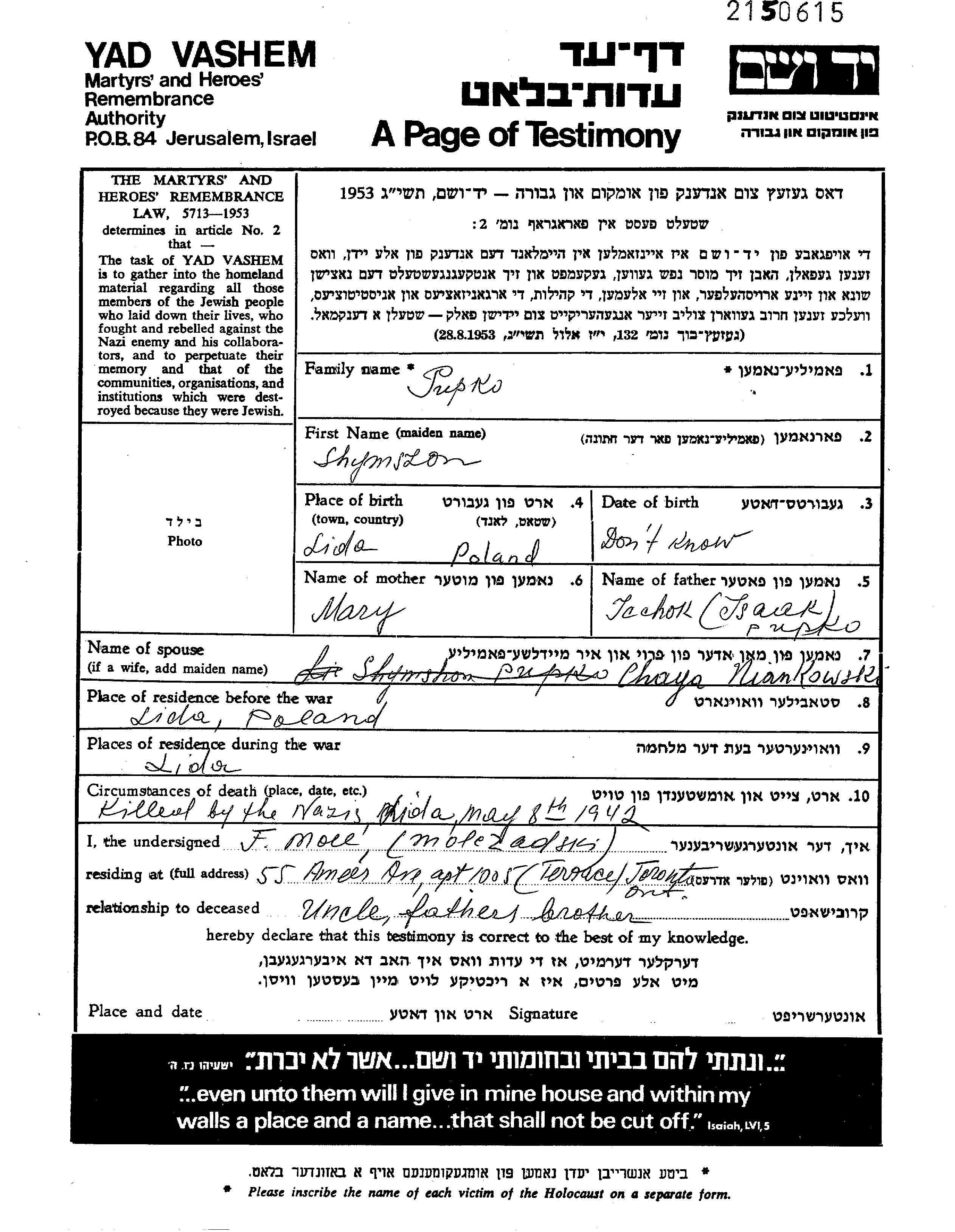 Пупко Попко Шимшон Лида, Польша Лист свидетельских показаний