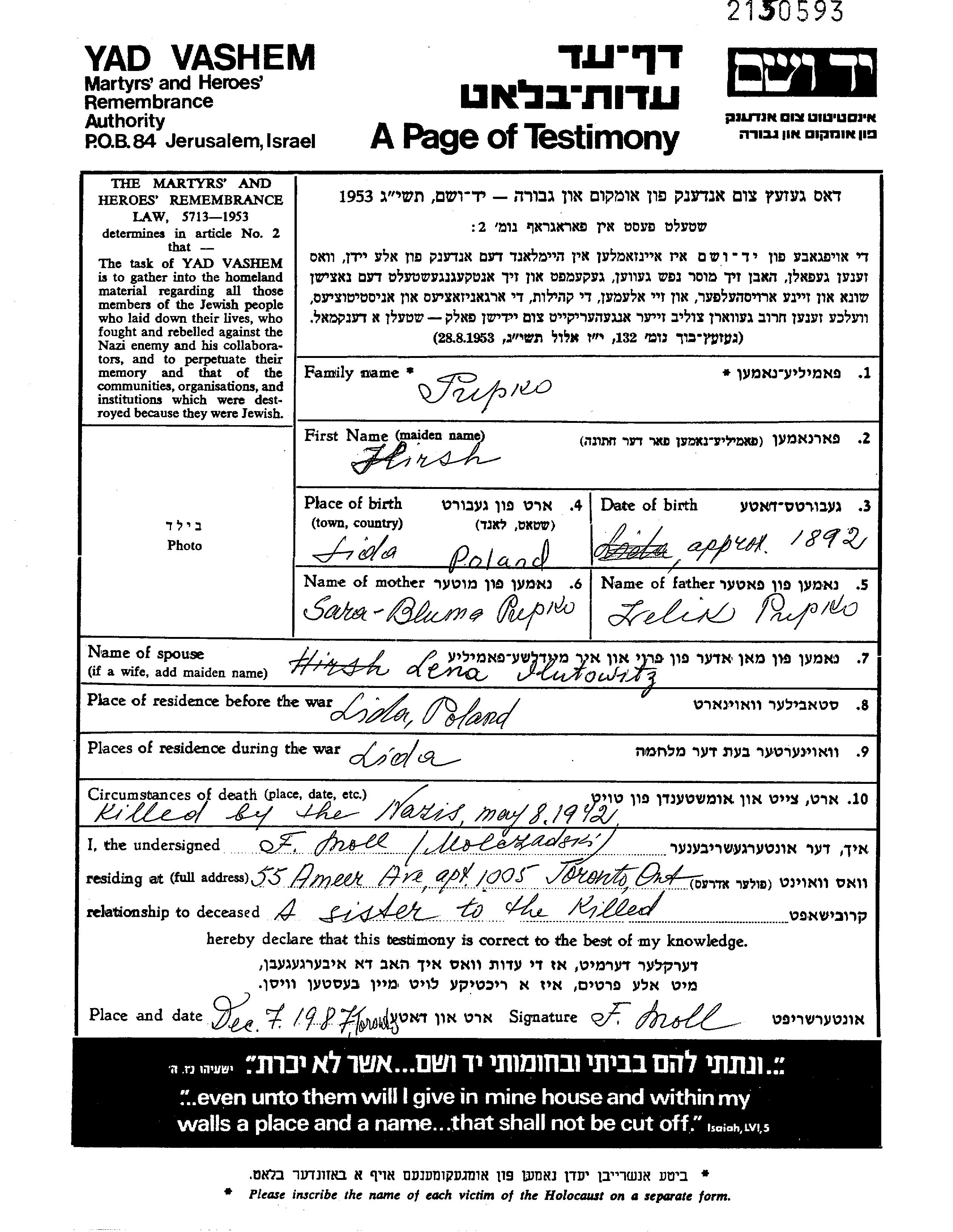 Пупко Попко Хирш Лида, Польша Лист свидетельских показаний