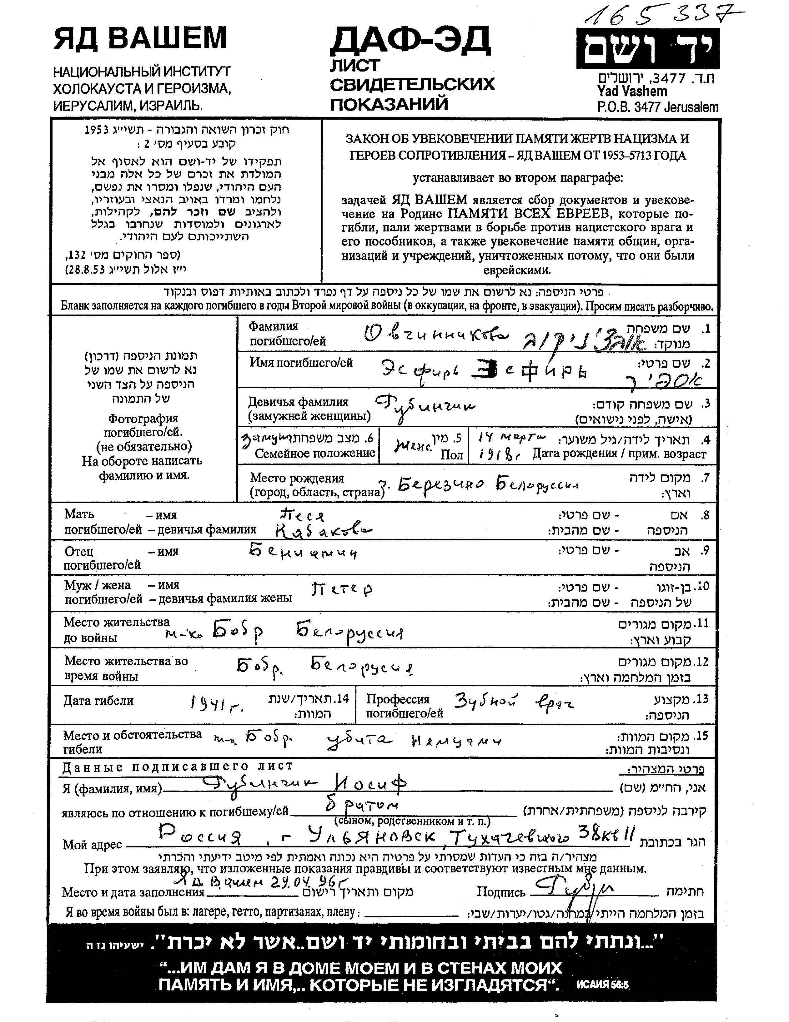 Овчинников Эсфирь 1918 Бобр, Белоруссия (СССР) Лист свидетельских показаний