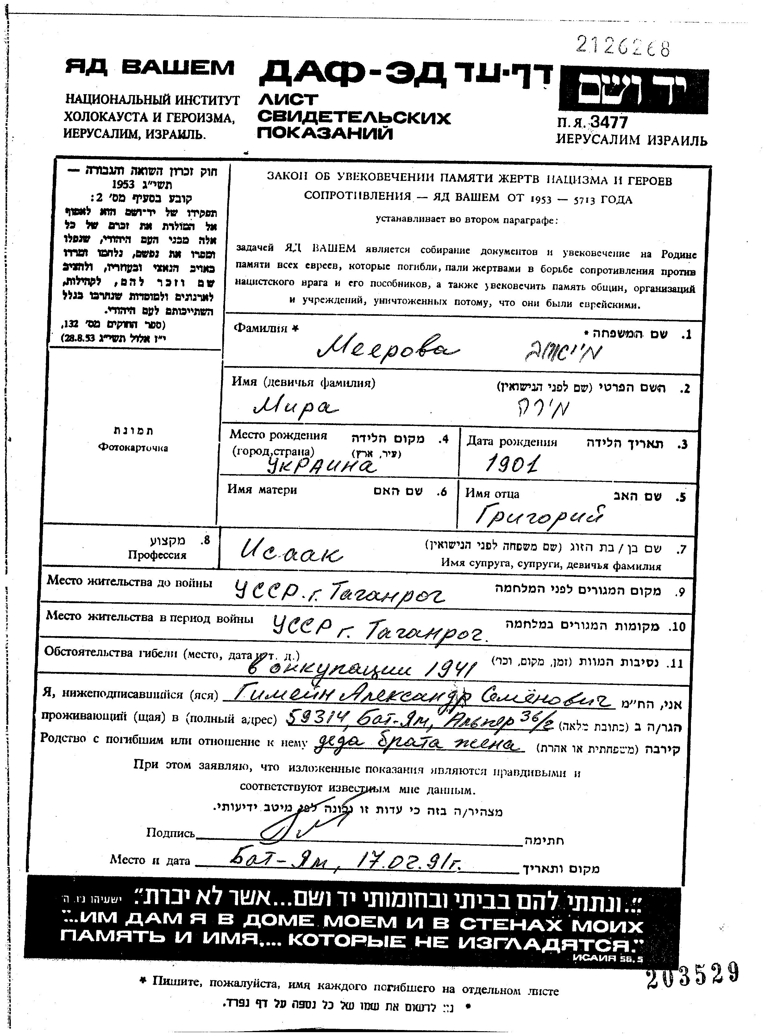Мееров Мира 1901 Таганрог, Россия (СССР) Лист свидетельских показаний