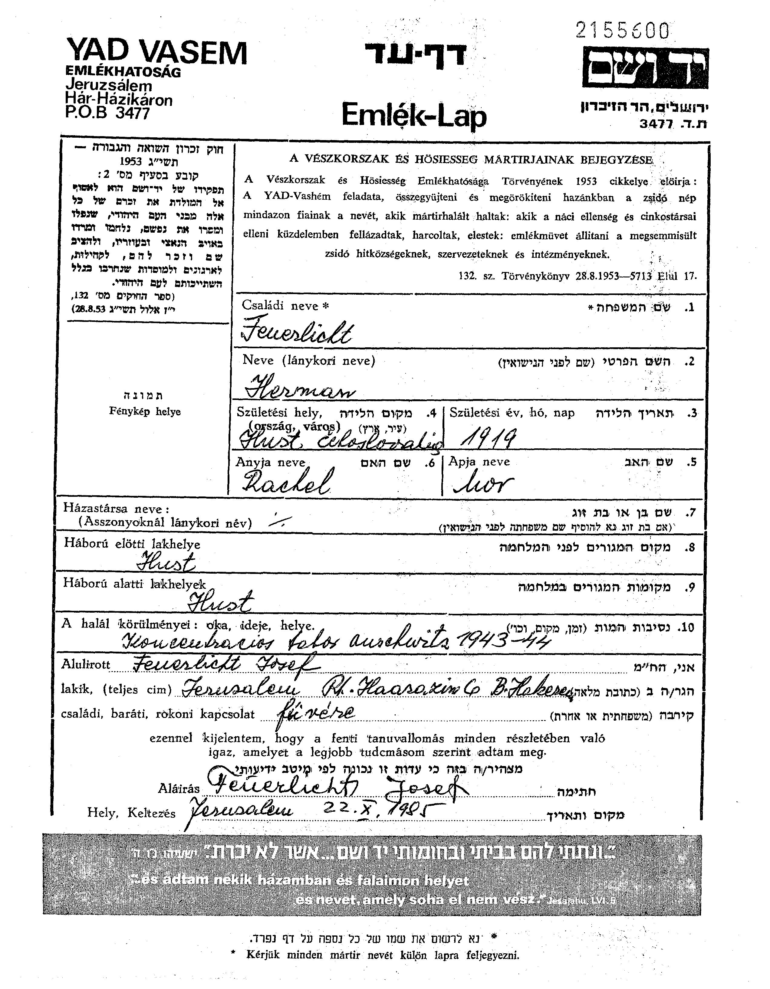 Херман Фойерлихт, место рождения: Хуст, Чехословакия. Отец: Мор, mать:Рахель, девичья фамилия Виссель Висель. Место жительства до войны: Хуст, Чехословакия. Место во время войны: Хуст, Чехословакия.