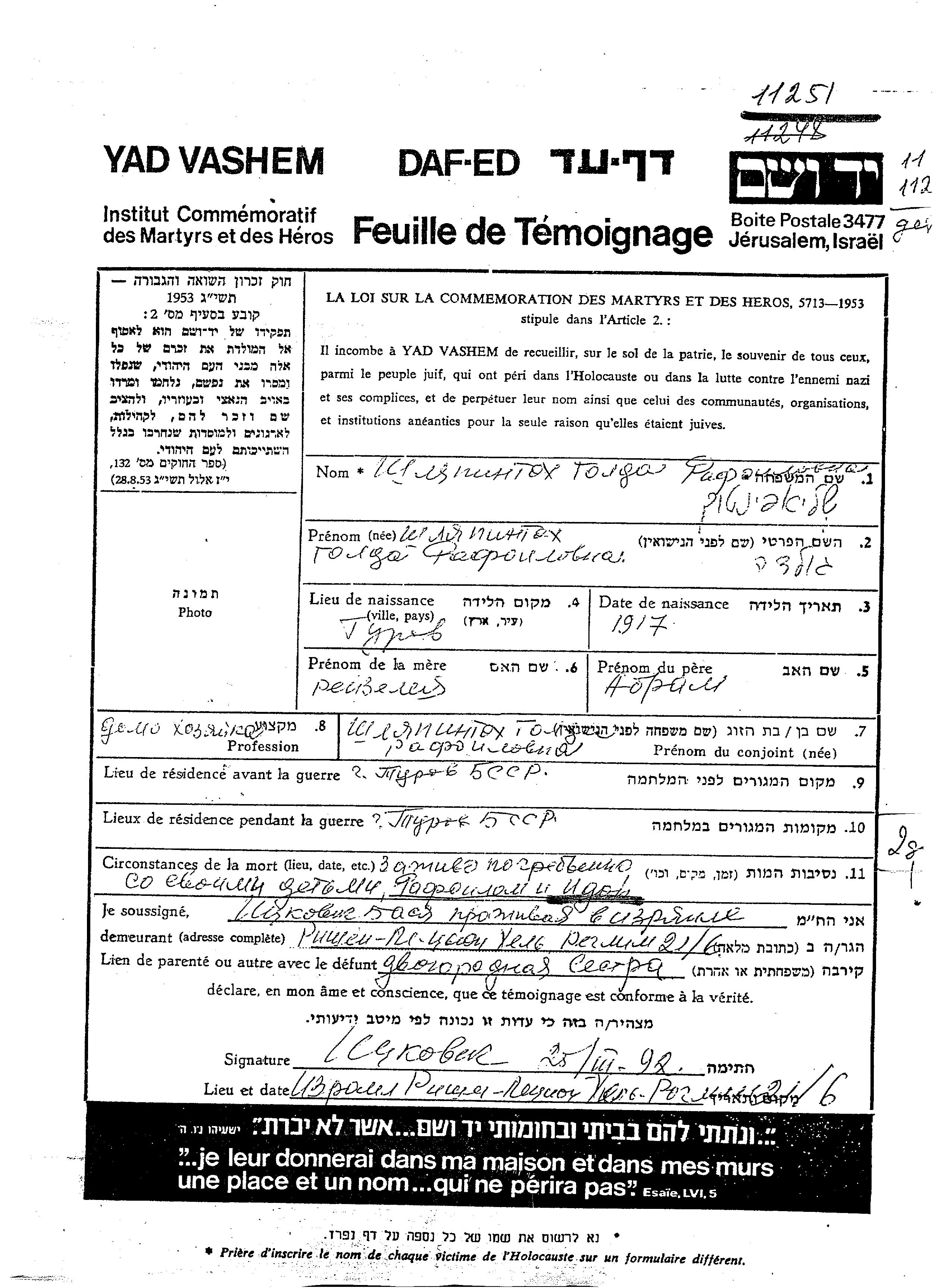 Яд Вашем - Листы свидетельских показаний Мемориального фонда