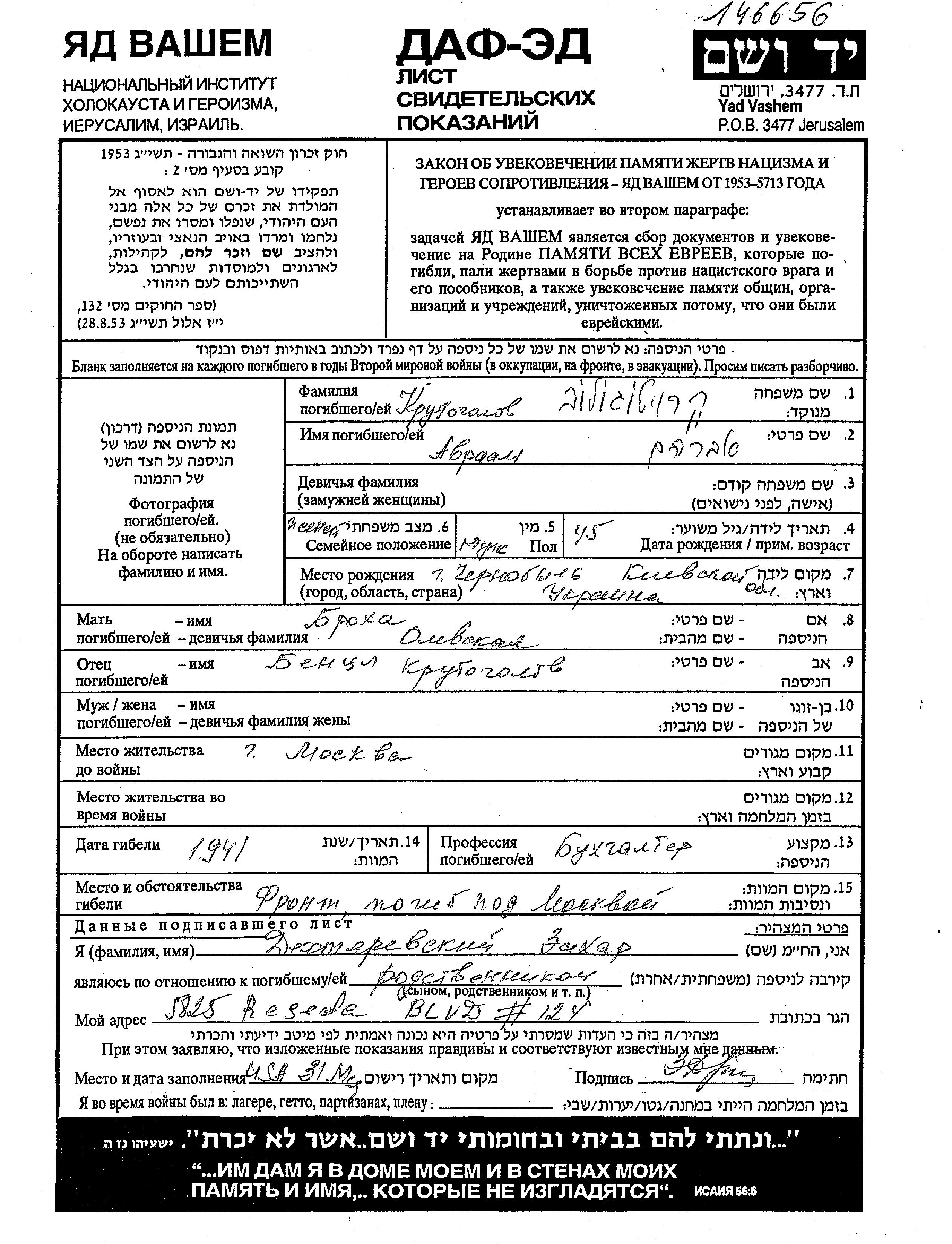 Авраам Крутоголов, место рождения: Чернобыль, Украина (СССР). Отец: Бенцл, mать:Броха, девичья фамилия Олевский. Бухгалтер / счетовод. Женат / замужем. Место жительства до войны: Москва, Россия (СССР). Место во время войны: Вооруженные силы Советского Союза. Авраам погиб на военной службе. место смерти: Москва, Россия (СССР) в 1941.