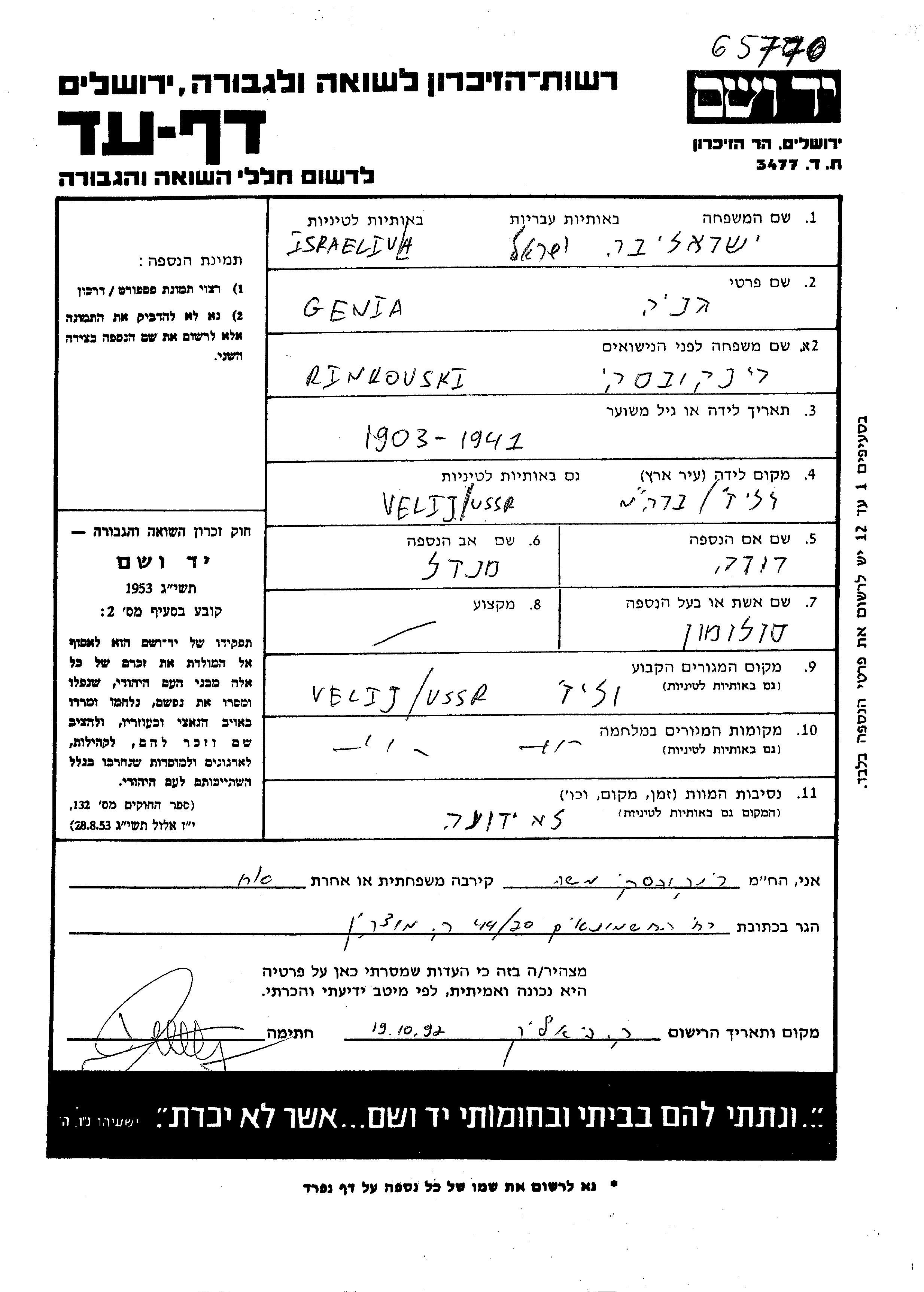 Геня Исраэль Israeliva, девичья фамилия Ринковски, место рождения: Велиж, Россия (СССР). Отец: Мендель, mать:Роза, девичья фамилия Черноморский. Женат / замужем. Место жительства до войны: Велиж, Россия (СССР). Место во время войны: Велиж, Россия (СССР).