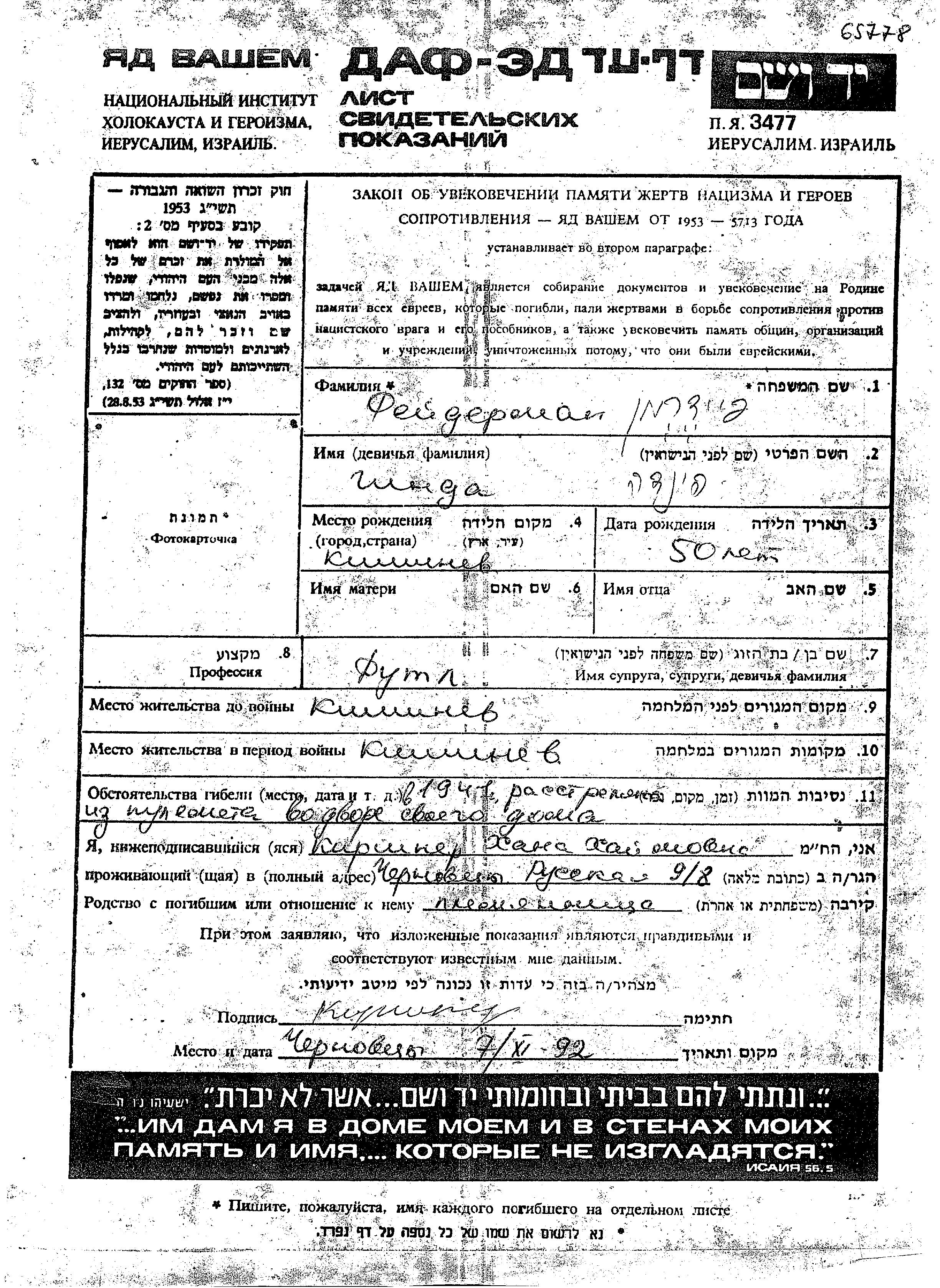 Яд Вашем - Листы свидетельских показаний Мемориального фонда