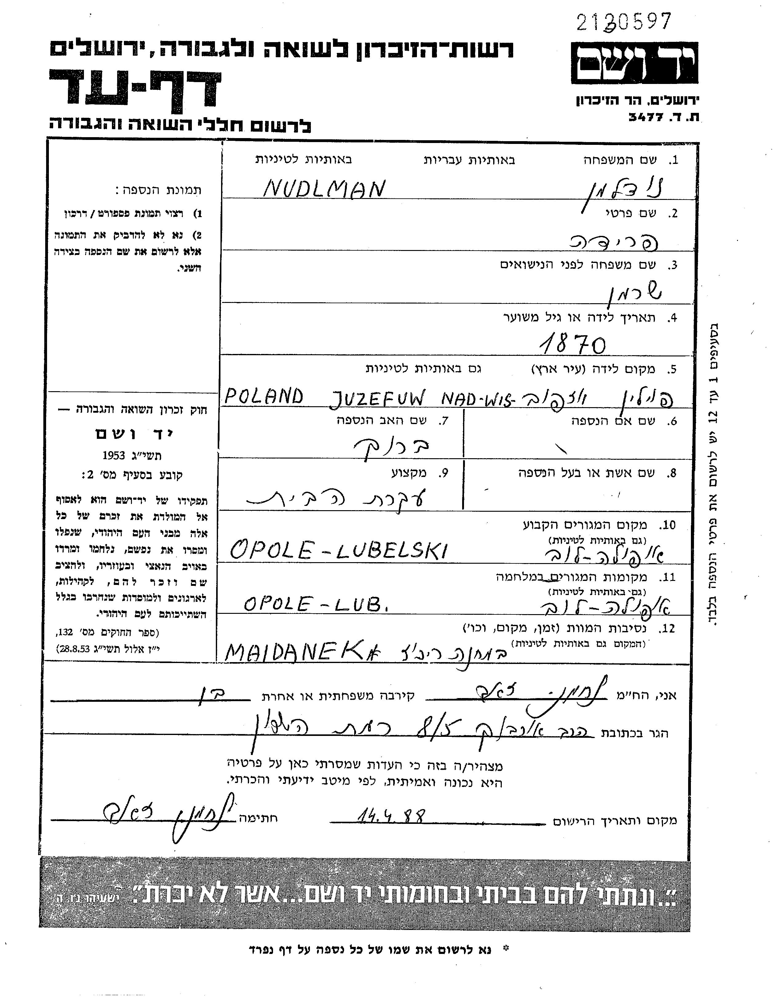Нудлман Фрида 1870 Ополе-Любельске, Польша Лист свидетельских показаний
