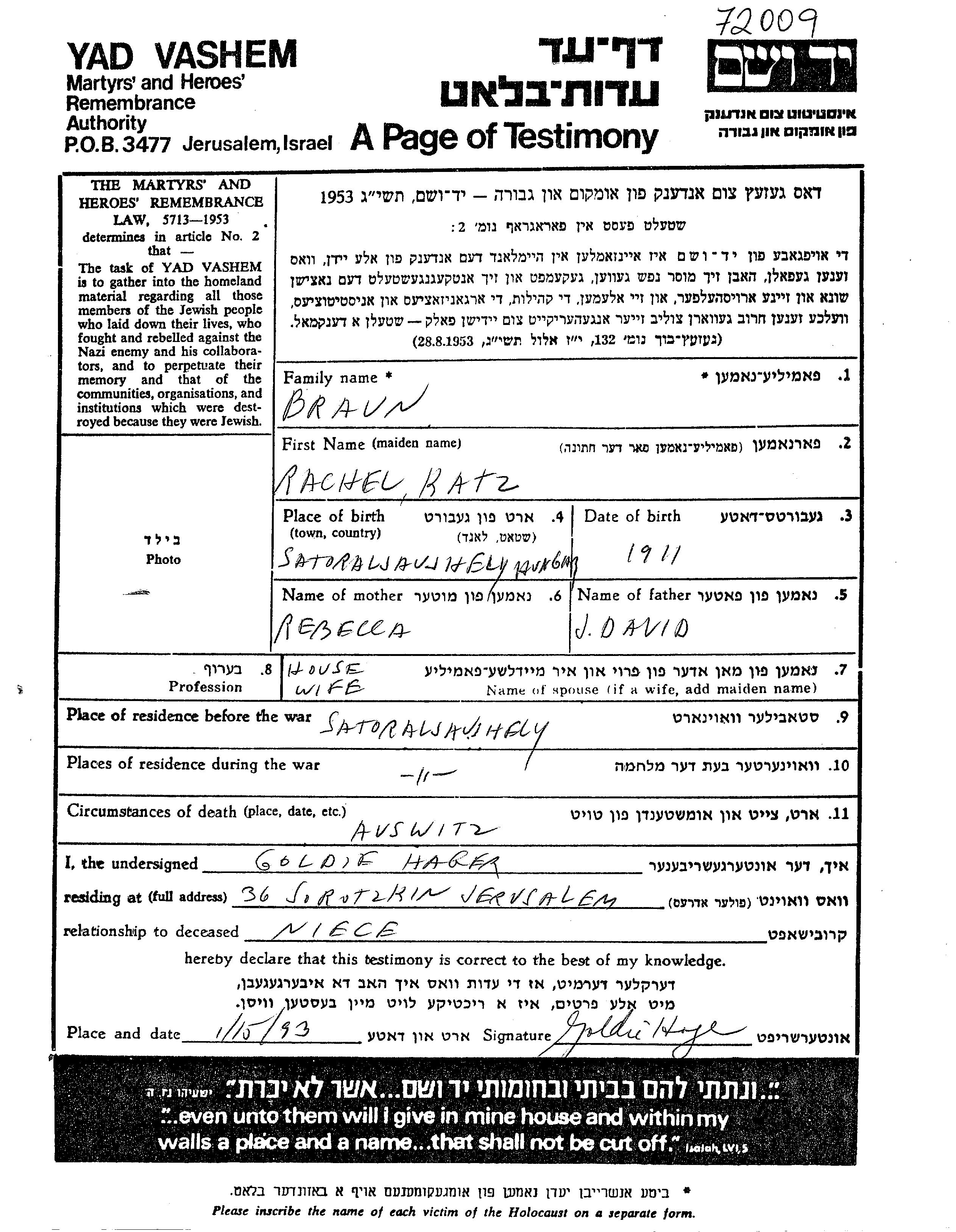 Рахель Браун, девичья фамилия Кац, место рождения: Шаторальяуйхей, Венгрия. Отец: Давид, mать:Ребекка. Домохозяйка. Женат / замужем. Место жительства до войны: Шаторальяуйхей, Венгрия. Место во время войны: Шаторальяуйхей, Венгрия.